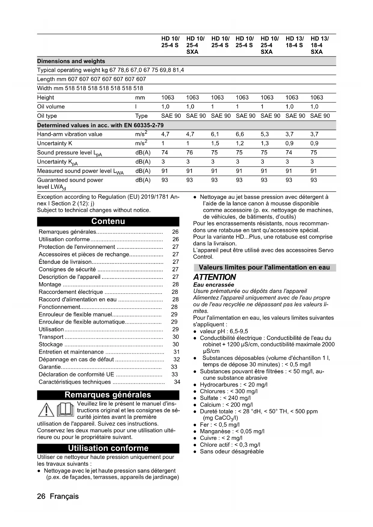 Device performance data Nozzle size of standard nozzle 047 047 055 050 050 075 075 Water operating pressure with stand- ard nozzle MPa25251922231818 Operating pressure (max.) MPa 28 28 22 25 26 25 25 Water flow rate l/min 16,67 16,67 16,67 16,67 16,67 21,67 21,67 High-pressure gun recoil force N 62 62 54 58 60 68 6826 Français Exception according to Regulation (EU) 2019/1781 An- nex I Section 2 (12): j) Subject to technical changes without notice. Contenu Remarques générales Veuillez lire le présent le manuel d'ins- tructions original et les consignes de sé- curité jointes avant la première utilisation de l'appareil. Suivez ces instructions. Conservez les deux manuels pour une utilisation ulté- rieure ou pour le propriétaire suivant. Utilisation conforme Utiliser ce nettoyeur haute pression uniquement pour les travaux suivants : ● Nettoyage avec le jet haute pression sans détergent (p.ex. de façades, terrasses, appareils de jardinage) ● Nettoyage au jet basse pression avec détergent à l’aide de la lance canon à mousse disponible comme accessoire (p. ex. nettoyage de machines, de véhicules, de bâtiments, d’outils) Pour les encrassements résistants, nous recomman- dons une rotabuse en tant qu'accessoire spécial. Pour la variante HD...Plus, une rotabuse est comprise dans la livraison. L’appareil peut être utilisé avec des accessoires Servo Control. Valeurs limites pour l'alimentation en eau ATTENTION Eau encrassée Usure prématurée ou dépôts dans l'appareil Alimentez l'appareil uniquement avec de l'eau propre ou de l'eau recyclée ne dépassant pas les valeurs li- mites. Pour l'alimentation en eau, les valeurs limites suivantes s'appliquent : ● valeur pH : 6,5-9,5 ● Conductibilité électrique : Conductibilité de l'eau du robinet + 1200 µS/cm, conductibilité maximale 2000 µS/cm ● Substances déposables (volume d'échantillon 1 l, temps de dépose 30 minutes) : < 0,5 mg/l ● Substances pouvant être filtrées : < 50 mg/l, au- cune substance abrasive ● Hydrocarbures : < 20 mg/l ● Chlorures : < 300 mg/l ● Sulfate : < 240 mg/l ● Calcium : < 200 mg/l ● Dureté totale : < 28 °dH, < 50° TH, < 500 ppm (mg CaCO