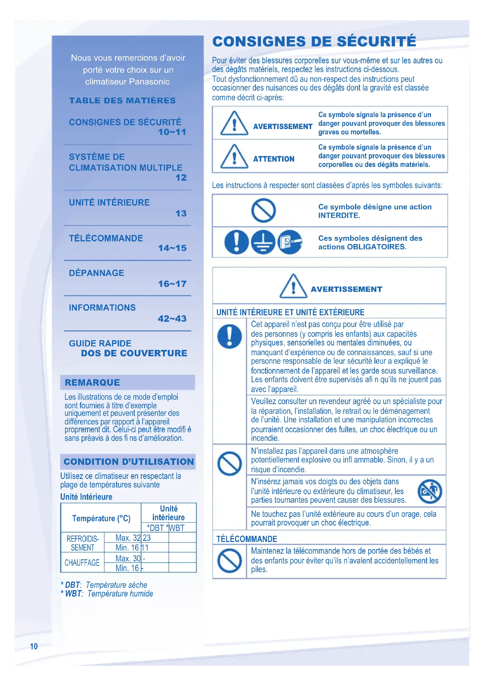Utilisez ce climatiseur en respectant la plage de températures suivante Unité Intérieure Température (°C) Unité intérieure *DBT *WBT REFROIDIS- SEMENT Max. 32 23 Min. 16 11 CHAUFFAGE Max. 30 - Min. 16 -