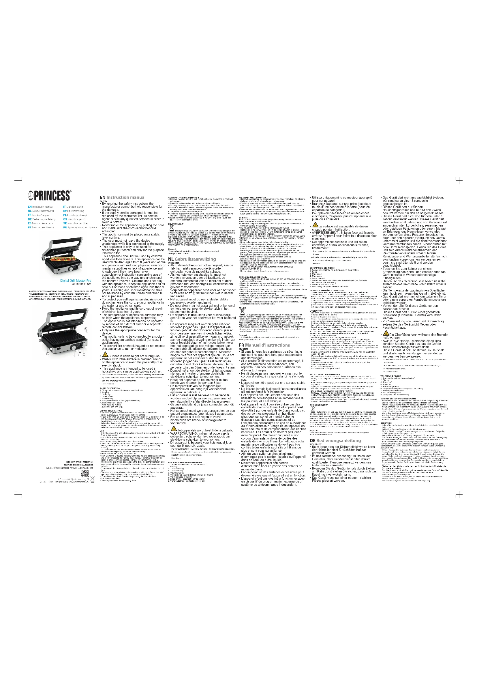 - Cet appareil est destiné à une utilisation domestique et aux applications similaires, notamment: – Coin cuisine des commerces, bureaux et autres environnements detravail.– Hôtels, motels et autres environnements de type résidentiel.– Environnements de type chambre d’hôtes.– Fermes.DESCRIPTION DES PIÈCES1. Boutons de contrôle de la température (haut et bas)2. Écran3. Minuterie+4. Minuterie-5. Bac à graisse6. Bouton de déclenchement de la plaque du grill (haut et bas)7. Plaques de grill amovibles8. Bouton d'ouverture à 180°9. Verrouillage du grill et butée d'extrémitéAVANT LA PREMIÈRE UTILISATION• Sortez l'appareil et les accessoires hors de la boîte.Retirez lesautocollants, le film protecteur ou le plastique de l'appareil.• Mettez l'appareil sur une surface stable plate et assurez un dégagementtout autour de l'appareil d'au moins 10 cm. Cet appareil ne convient pasà une installation dans une armoire ou à un usage à l'extérieur.• À la première mise en marche de l'appareil, une légère odeur estperceptible. C'est normal : assurez une ventilation adéquate. Cette odeurest seulement temporaire et disparaît rapidement.UTILISATION• Graissez légèrement le revêtement antiadhésif des plaques de cuissonavec de l’huile ou du beurre.• Branchez la prise de courant.• Réglez les deux boutons de température (plaque supérieure et inférieuredu gril) à la température souhaitée.• Vérifiez l'affichage pour connaître la température exacte.• Les boutons de température servent à régler et à maintenir latempérature pendant la cuisson. Vous pouvez faire varier la températureà tout moment pendant la cuisson.ATTENTION: N'utilisez pas cet appareil pour cuire ou décongeler desaliments surgelés. Tous les aliments doivent être complètementdécongelés avant d'être cuits.• Ouvrez l'appareil en tirant la poignée vers le haut.• Placez maintenant les ingrédients préparés sur la plaque de grillinférieure et fermez le grill en appuyant sur la poignée vers le bas. Laplaque supérieure s’incline pour uniformiser la pression. La duréenormale de préparation est de 5 à 8minutes; la durée exacte dépend duplat, de la température réglée et de votre goût personnel. L'appareil étantfermé, le processus de cuisson est plus rapide.• Vous pouvez régler la distance entre les plaques de grill en ajustant leverrou de grill.• L'appareil peut également être utilisé comme gril de table. Appuyez surle bouton d'ouverture à 180° et ouvrez à plat sur une surface résistante àla chaleur.• Vous pouvez utiliser la fonction de minuterie en appuyant sur lesboutons de la minuterie.• Réglez le temps souhaité.• L'écran affiche le temps restant.NETTOYAGE ET MAINTENANCE• Débranchez la fiche du secteur et laissez l’appareil refroidir ouvert.• Nettoyez les plaques de cuisson avec un chiffon humide ou une brossedouce.• Pour faciliter le nettoyage, vous pouvez également retirer les plaques del'appareil.• Appuyez sur les boutons de déclenchement pour libérer les plaques.Nettoyez les plaques sous l'eau courante, puis séchez-les.• Les plaques ne passent pas au lave-vaisselle.• Nettoyez l'appareil avec un chiffon humide. N'utilisez pas de produitsnettoyants agressifs ou abrasifs, de tampons à récurer ou de laine deverre, ceux-ci pourraient endommager l'appareil.• N'immergez jamais l'appareil dans l'eau ni aucun autre liquide. L'appareilne sont pas lavables au lave-vaisselle.ENVIRONNEMENTCet appareil ne doit pas être jeté avec les déchets ménagers à lafin de sa durée de vie, il doit être remis à un centre de recyclage pour lesappareils électriques et électroniques. Ce symbole sur l'appareil, lemanuel d'utilisation et l'emballage attire votre attention sur un pointimportant. Les matériaux utilisés dans cet appareil sont recyclables. Enrecyclant vos appareils, vous contribuez de manière significative à laprotection de notre environnement. Renseignez-vous auprès des autoritéslocales pour connaître les centres de collecte des déchets.SupportVous retrouvez toutes les informations et pièces de rechange surwww.princesshome.eu! DEBedienungsanleitung SICHERHEIT