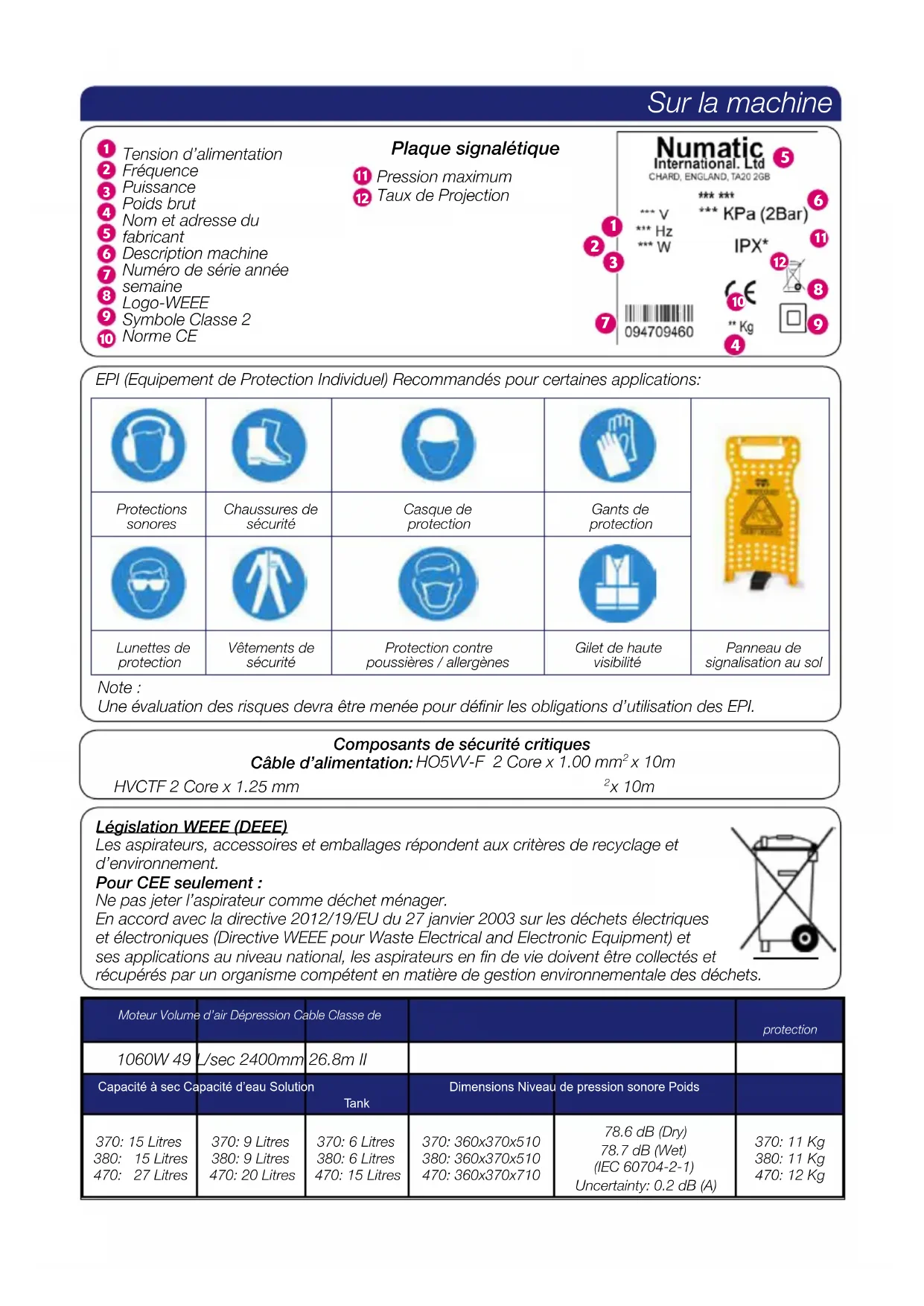 Protections sonores Chaussures de sécurité Casque de protection Gants de protection Lunettes de protection Vêtements de sécurité Protection contre poussières / allergènes Gilet de haute visibilité Panneau de signalisation au sol EPI (Equipement de Protection Individuel) Recommandés pour certaines applications: Note : Une évaluation des risques devra être menée pour dénir les obligations d’utilisation des EPI. Moteur Volume d’air Dépression Cable Classe de protection 1060W 49 L/sec 2400mm 26.8m II Capacité à sec Capacité d’eau Solution Tank Dimensions Niveau de pression sonore Poids 370: 15 Litres 380: 15 Litres 470: 27 Litres 370: 9 Litres 380: 9 Litres 470: 20 Litres 370: 6 Litres 380: 6 Litres 470: 15 Litres 370: 360x370x510 380: 360x370x510 470: 360x370x710