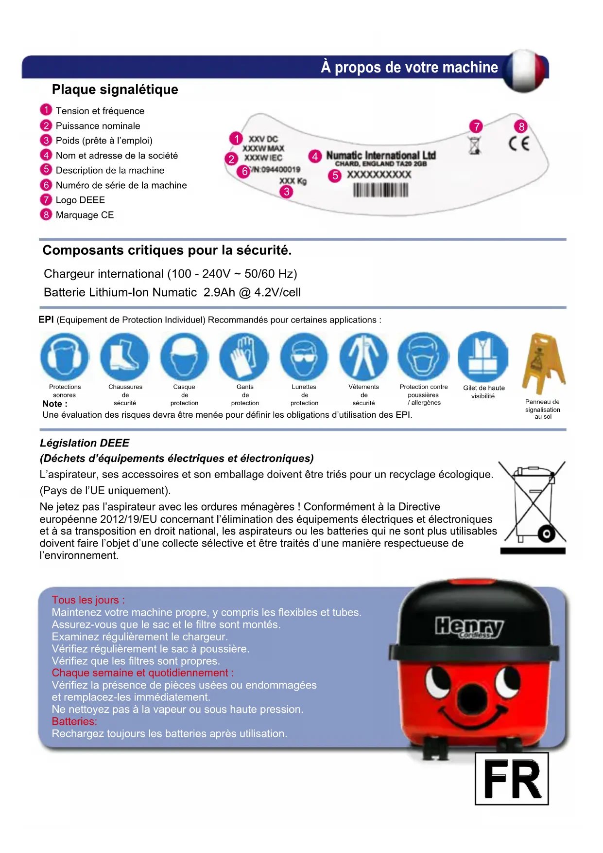 Tension et fréquence Puissance nominale Poids (prête à l’emploi) Nom et adresse de la société Description de la machine Numéro de série de la machine Logo DEEE Marquage CE Législation DEEE (Déchets d’équipements électriques et électroniques) L’aspirateur, ses accessoires et son emballage doivent être triés pour un recyclage écologique. (Pays de l’UE uniquement). Ne jetez pas l’aspirateur avec les ordures ménagères ! Conformément à la Directive européenne 2012/19/EU concernant l’élimination des équipements électriques et électroniques et à sa transposition en droit national, les aspirateurs ou les batteries qui ne sont plus utilisables doivent faire l’objet d’une collecte sélective et être traités d’une manière respectueuse de l’environnement. Chargeur international (100 - 240V ~ 50/60 Hz) Batterie Lithium-Ion Numatic 2.9Ah @ 4.2V/cell Tous les jours : Maintenez votre machine propre, y compris les exibles et tubes. Assurez-vous que le sac et le ltre sont montés. Examinez régulièrement le chargeur. Vériez régulièrement le sac à poussière. Vériez que les ltres sont propres. Chaque semaine et quotidiennement : Vériez la présence de pièces usées ou endommagées et remplacez-les immédiatement. Ne nettoyez pas à la vapeur ou sous haute pression. Batteries: Rechargez toujours les batteries après utilisation. Composants critiques pour la sécurité. Gilet de haute visibilitéProtections sonoresChaussures sécuritéCasque protectionGants protectionProtection contre poussières / allergènesLunettes protectionVêtements sécurité EPI (Equipement de Protection Individuel) Recommandés pour certaines applications : Note : Une évaluation des risques devra être menée pour dénir les obligations d’utilisation des EPI.Panneau de signalisation au sol