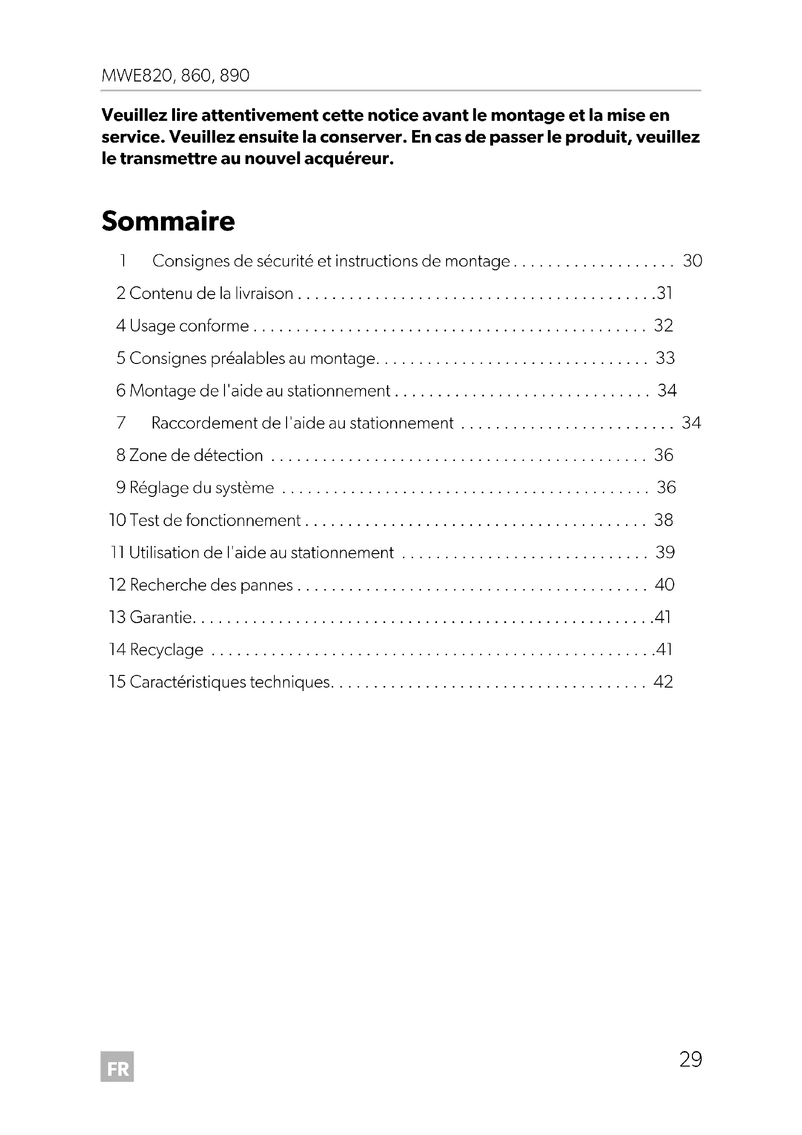AVIS ! Arrêtez le véhicule et contrôlez immédiatement la situation (si néces- saire, descendez du véhicule) si les événements suivants se produisent lors d’une manœuvre : Lors d’une manœuvre, l’appareil indique d'abord un obstacle et la fré- quence des bips sonores augmente comme prévu (par exemple, pas- sage de la fréquence lente à la fréquence moyenne). Le signal sonore passe tout à coup à la fréquence d'émission lente ou n’indique plus aucun obstacle. Ceci signifie que l’obstacle initial ne se trouve plus dans la zone de détection des détecteurs (en raison de la forme des détecteurs), mais qu’une collision reste possible. AVIS ! Le système ne fonctionne plus convenablement lorsqu'un ou plusieurs détecteurs sont défectueux. MWE820-860-890-IO-16s.book Seite 40 Freitag, 26. August 2016 9:19 21FR MWE820, 860, 890 Garantie