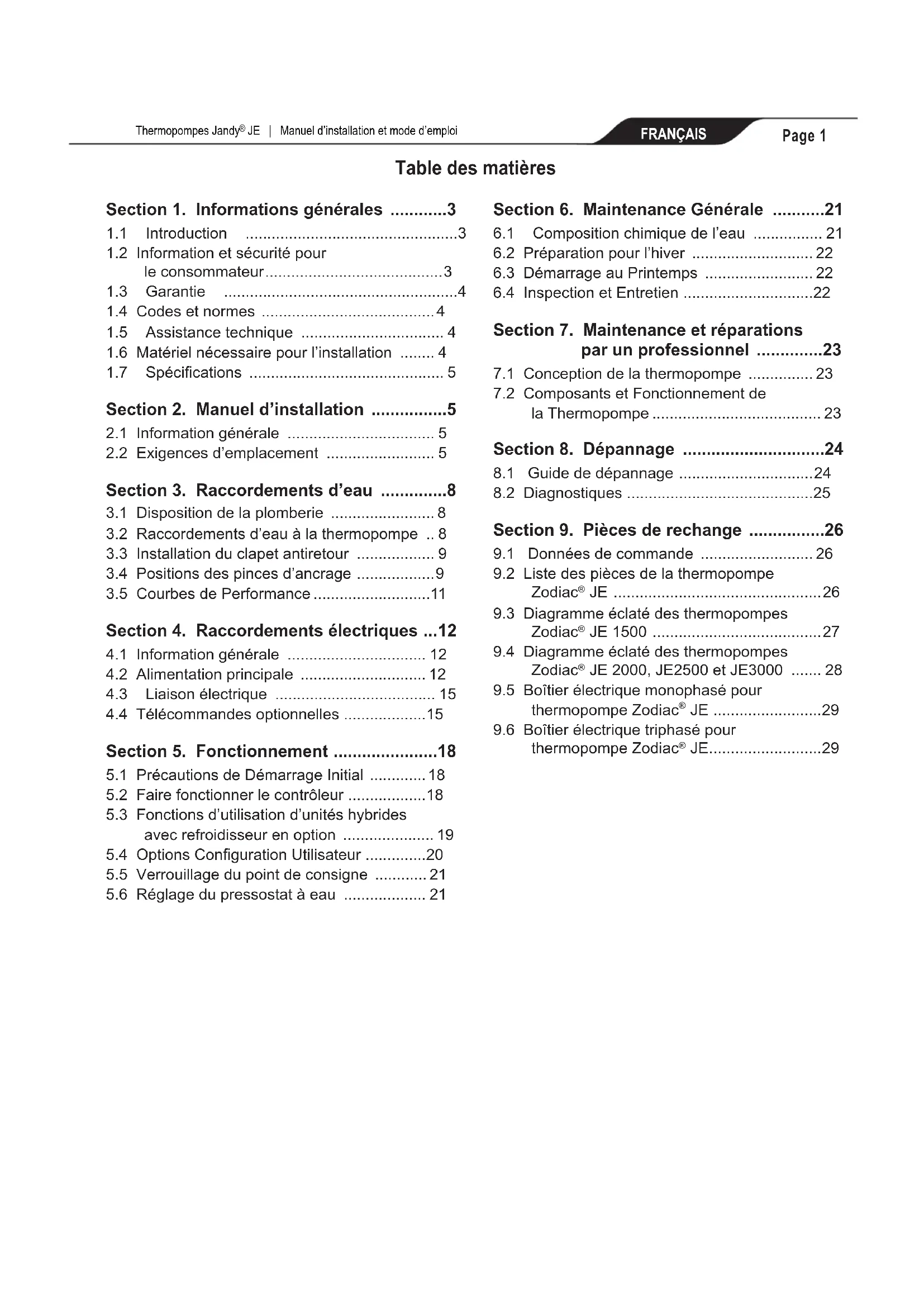 Ce guide fournit les instructions d’installation et d'utilisation pour les thermopompes de la série JE de Jandy Pro. Lire les présentes instructions d’installation et d’utilisation au complet avant de procéder à l’installation. Consulter Zodiac Pool Systems Inc (“Zodiac”), ou un représentant local pour toute question concernant cet équipement. Pour obtenir des copies supplémentaires de ce manuel, communiquer avec nous en composant le 800-822-7933. Zodiac Pool Systems, Inc. 2620 Commerce Way Vista, CA 92081 USA La thermopompe JE de la série Jandy Pro reçoit le courant électrique d’une source extérieure et fournit un système duel de thermostat à commande numérique pour les combinaisons piscine et spa ou pour une facilité de préchauffage. Cette thermopompe est spécifiquement conçue pour le chauffage de piscines et de spas à eau douce. Ne pas l’utiliser comme appareil de chauffage de service général. Communiquer avec votre fournisseur pour les produits Zodiac