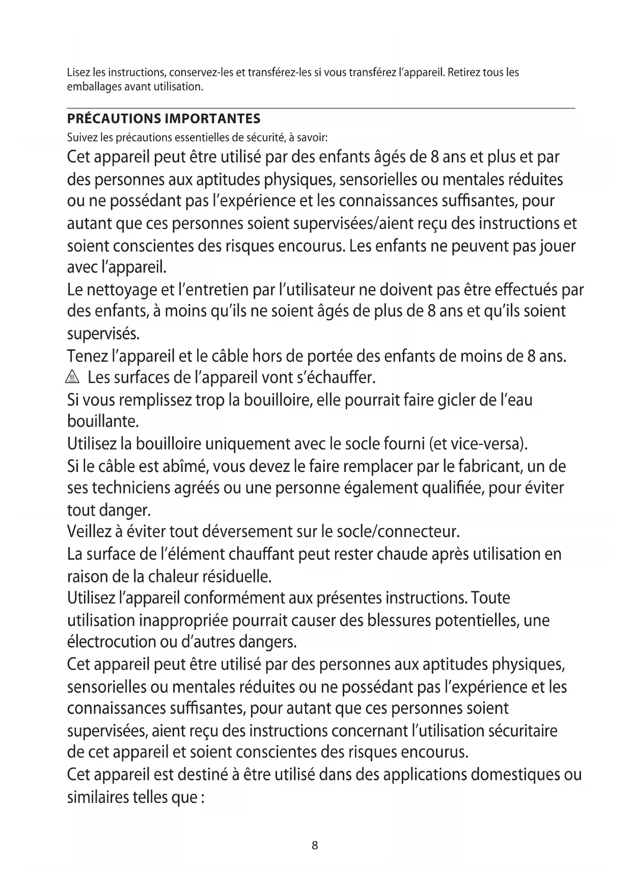 Suivez les précautions essentielles de sécurité, à savoir: Cet appareil peut être utilisé par des enfants âgés de 8 ans et plus et par des personnes aux aptitudes physiques, sensorielles ou mentales réduites ou ne possédant pas l’expérience et les connaissances susantes, pour autant que ces personnes soient supervisées/aient reçu des instructions et soient conscientes des risques encourus. Les enfants ne peuvent pas jouer avec l’appareil. Le nettoyage et l’entretien par l’utilisateur ne doivent pas être eectués par des enfants, à moins qu’ils ne soient âgés de plus de 8 ans et qu’ils soient supervisés. Tenez l’appareil et le câble hors de portée des enfants de moins de 8 ans. h Les surfaces de l’appareil vont s’échauer. Si vous remplissez trop la bouilloire, elle pourrait faire gicler de l’eau bouillante. Utilisez la bouilloire uniquement avec le socle fourni (et vice-versa). Si le câble est abîmé, vous devez le faire remplacer par le fabricant, un de ses techniciens agréés ou une personne également qualiée, pour éviter tout danger. Veillez à éviter tout déversement sur le socle/connecteur. La surface de l’élément chauant peut rester chaude après utilisation en raison de la chaleur résiduelle. Utilisez l’appareil conformément aux présentes instructions. Toute utilisation inappropriée pourrait causer des blessures potentielles, une électrocution ou d’autres dangers. Cet appareil peut être utilisé par des personnes aux aptitudes physiques, sensorielles ou mentales réduites ou ne possédant pas l’expérience et les connaissances susantes, pour autant que ces personnes soient supervisées, aient reçu des instructions concernant l’utilisation sécuritaire de cet appareil et soient conscientes des risques encourus. Cet appareil est destiné à être utilisé dans des applications domestiques ou similaires telles que :9