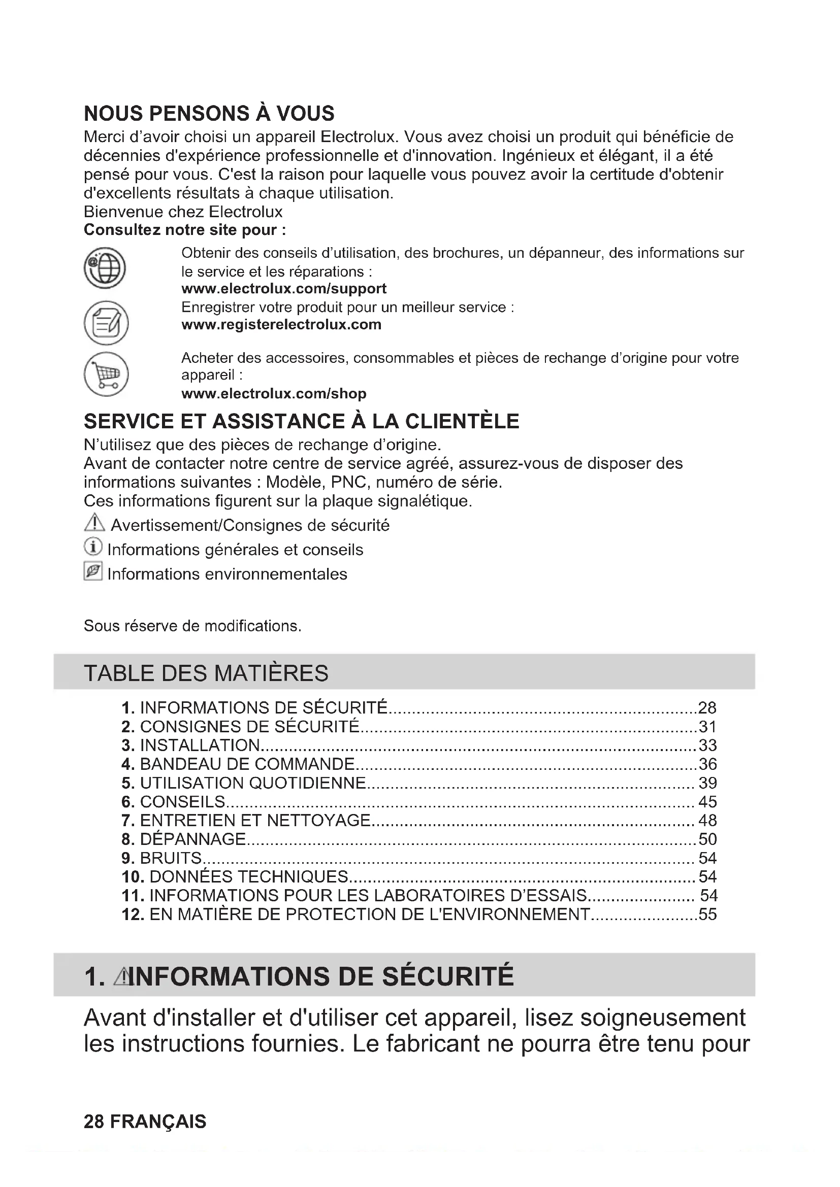 Merci d’avoir choisi un appareil Electrolux. Vous avez choisi un produit qui bénéficie dedécennies d'expérience professionnelle et d'innovation. Ingénieux et élégant, il a étépensé pour vous. C'est la raison pour laquelle vous pouvez avoir la certitude d'obtenird'excellents résultats à chaque utilisation.Bienvenue chez ElectroluxConsultez notre site pour :Obtenir des conseils d’utilisation, des brochures, un dépanneur, des informations surle service et les réparations :www.electrolux.com/supportEnregistrer votre produit pour un meilleur service :www.registerelectrolux.comAcheter des accessoires, consommables et pièces de rechange d’origine pour votreappareil :www.electrolux.com/shop