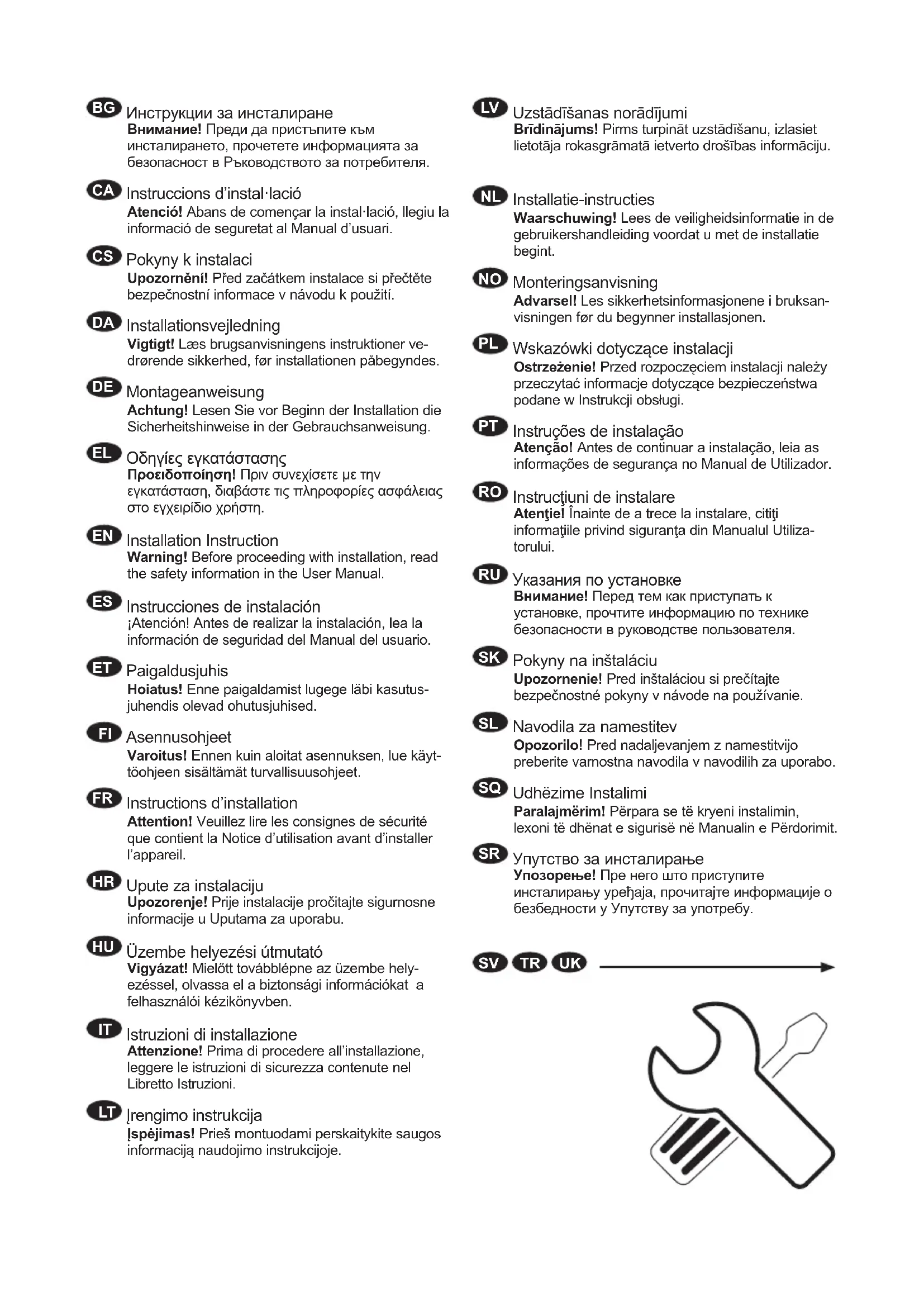 Instructions d’installation Attention! Veuillez lire les consignes de sécurité que contient la Notice d’utilisation avant d’installer l’appareil.