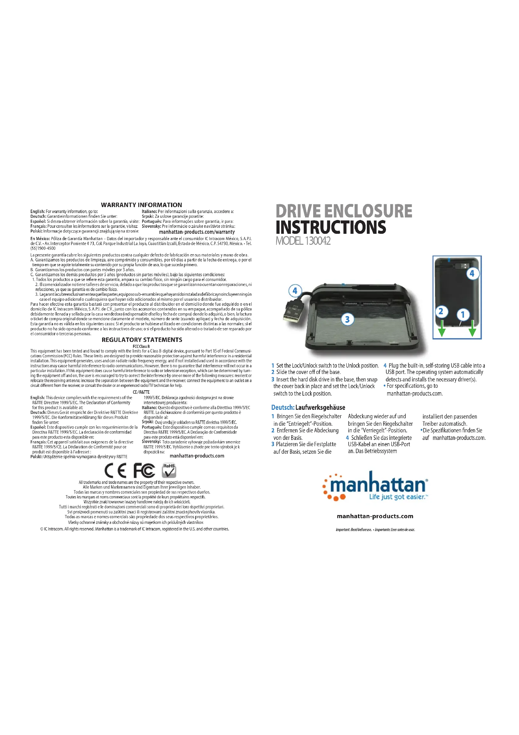 - Para más especicaciones, visite manhattan-products.com. Español: Gabinete para Disco Duro 1 Mettez l’interrupteur en position déverrouillé. 2 Enlevez le capot du socle. 3 Insérez le disque dur dans le socle, puis replacez le capot et mettez l’interrupteur en position verrouillé. 4 Connectez le câble USB intégré à un port USB. Le système d’exploitation détecte le dispositif et installe le pilote nécessaire automatiquement.
