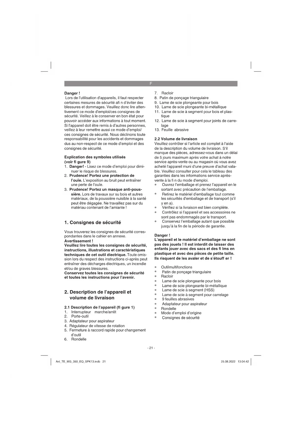 Après un arrêt dû à une surcharge, l’appareil se remet automatiquement en marche. Outils employés Scier : Scier du bois et du plastique. Consignes de travail : Faites attention aux corps étrangers lorsque vous sciez et ôtez-les le cas échéant. Lors du sciage en plongée, usinez exclusivement des matériaux souples tels du bois ou du placo- plâtre. Anl_TE_MG_350_EQ_SPK13.indb 23Anl_TE_MG_350_EQ_SPK13.indb 23 25.08.2022 13:04:4325.08.2022 13:04:43F
