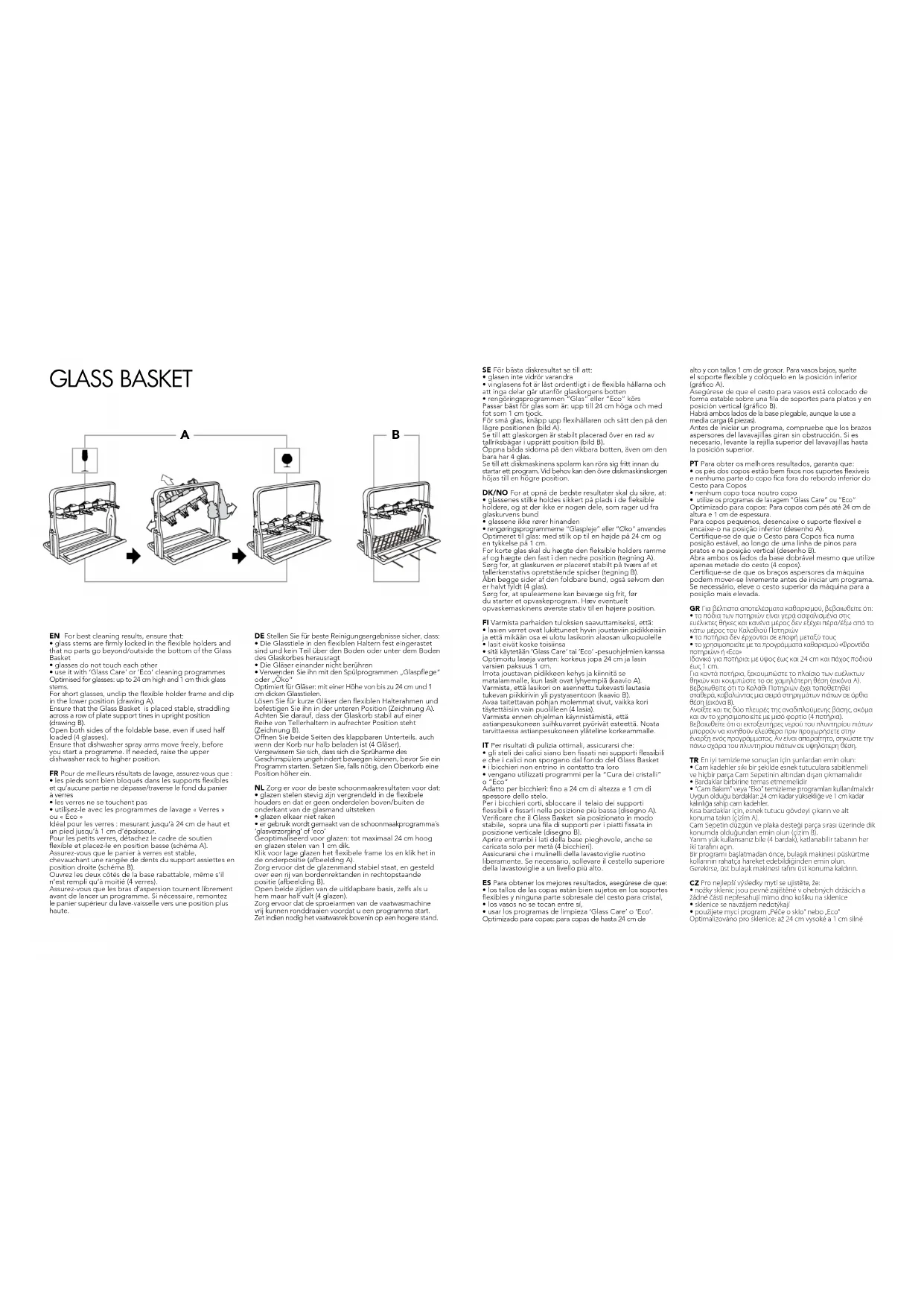 - utilisez-le avec les programmes de lavage «Verres» ou «Éco» Idéal pour les verres: mesurant jusqu’à 24cm de haut et un pied jusqu’à 1 cm d’épaisseur. Pour les petits verres, détachez le cadre de soutien flexible et placez-le en position basse (schéma A). Assurez-vous que le panier à verres est stable, chevauchant une rangée de dents du support assiettes en position droite (schéma B). Ouvrez les deux côtés de la base rabattable, même s’il n’est rempli qu’à moitié (4 verres). Assurez-vous que les bras d’aspersion tournent librement avant de lancer un programme. Si nécessaire, remontez le panier supérieur du lave-vaisselle vers une position plus haute. DE Stellen Sie für beste Reinigungsergebnisse sicher, dass: