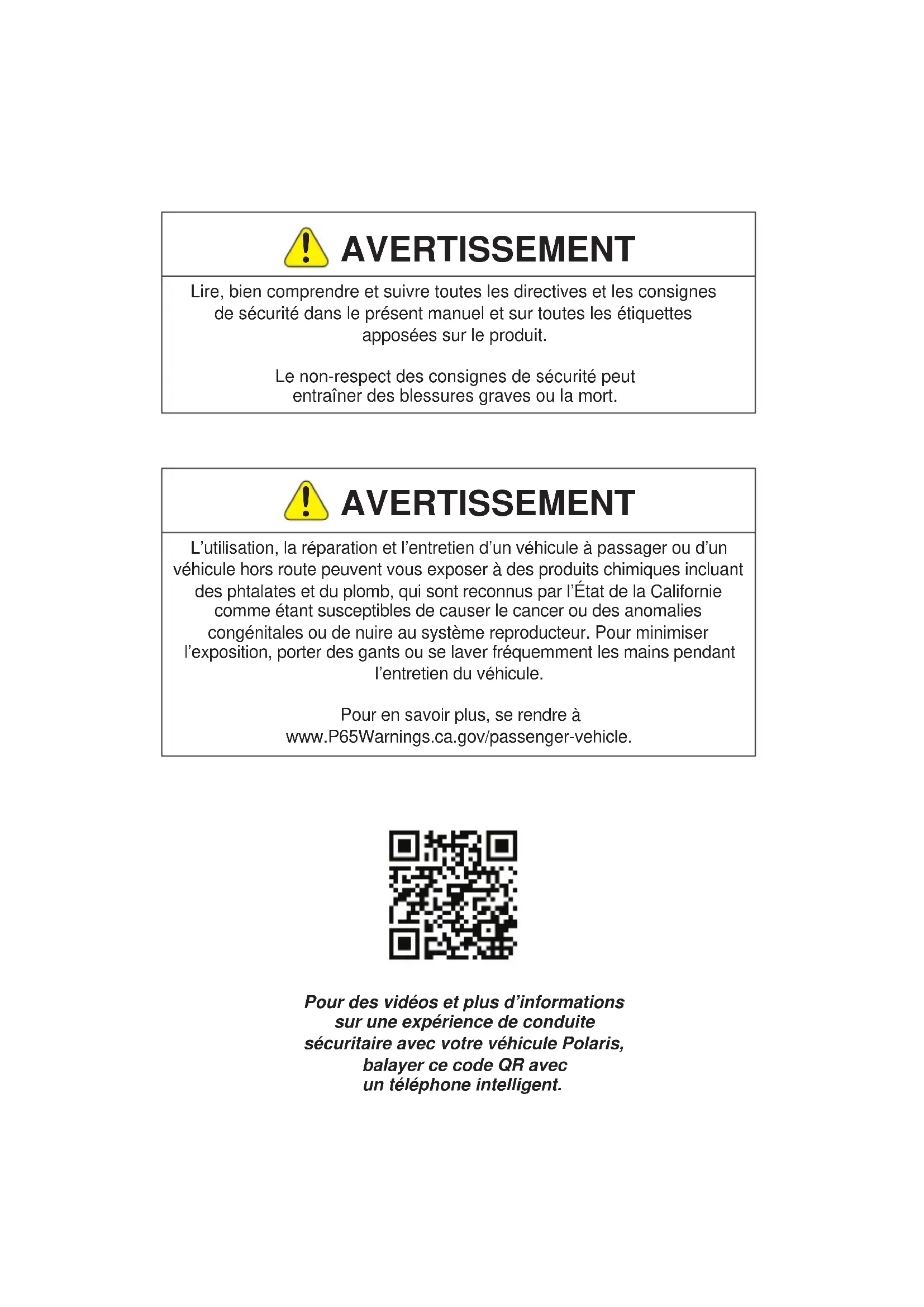 GEM eLXDAVERTISSEMENT L’utilisation, la réparation et l’entretien d’un véhicule à passager ou d’un véhicule hors route peuvent vous exposer à des produits chimiques incluant des phtalates et du plomb, qui sont reconnus par l’État de la Californie comme étant susceptibles de causer le cancer ou des anomalies congénitales ou de nuire au système reproducteur. Pour minimiser l’exposition, porter des gants ou se laver fréquemment les mains pendant l’entretien du véhicule. Pour en savoir plus, se rendre à www.P65Warnings.ca.gov/passenger-vehicle.