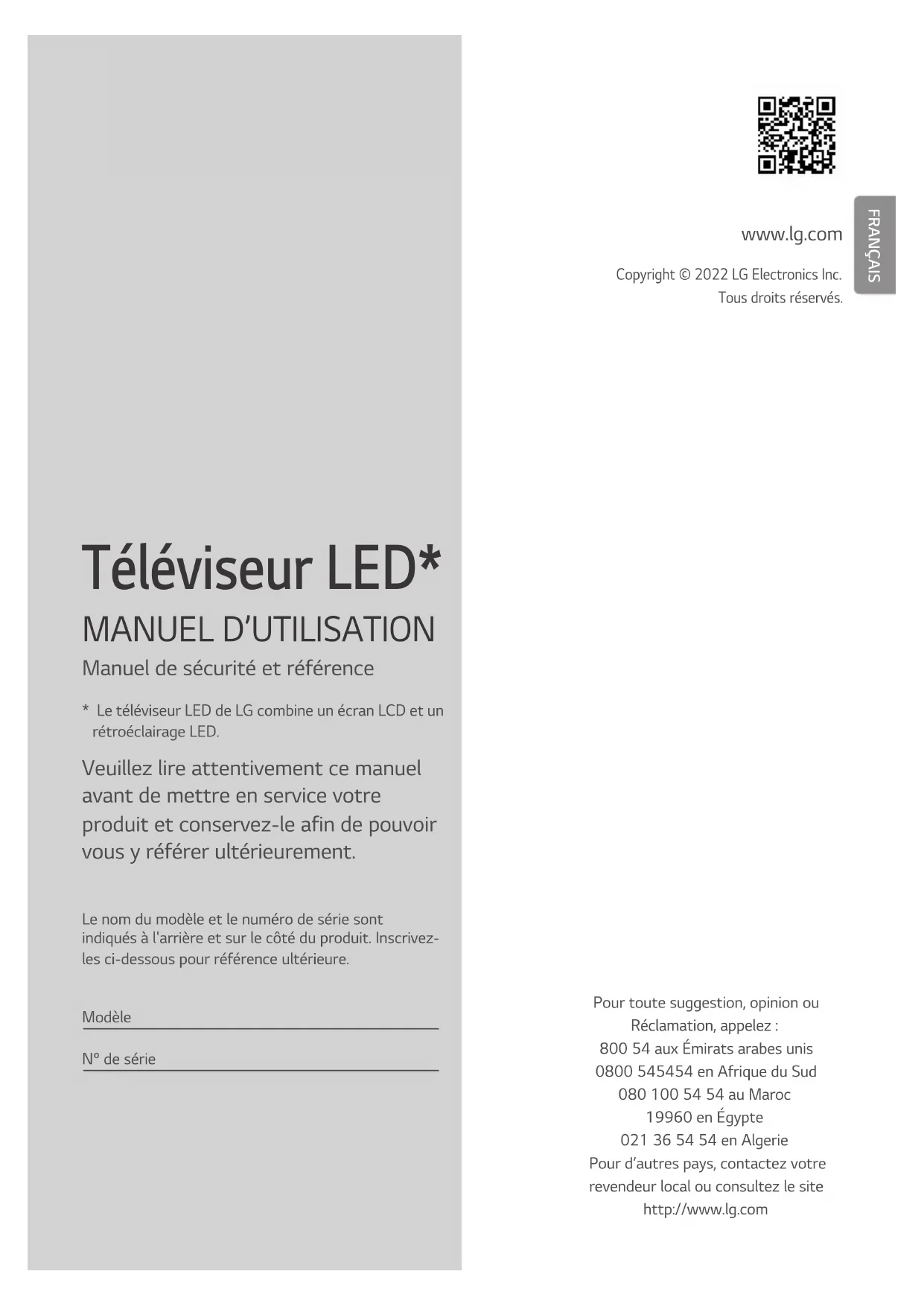 - Le téléviseur LED de LG combine un écran LCD et un rétroéclairage LED. Le nom du modèle et le numéro de série sont indiqués à l'arrière et sur le côté du produit. Inscrivez- les ci-dessous pour référence ultérieure. Modèle Nº de série Pour toute suggestion, opinion ou Réclamation, appelez : 800 54 aux Émirats arabes unis 0800 545454 en Afrique du Sud 080 100 54 54 au Maroc 19960 en Égypte 021 36 54 54 en Algerie Pour d’autres pays, contactez votre revendeur local ou consultez le site http://www.lg.com2 Avant de lire ce manuel