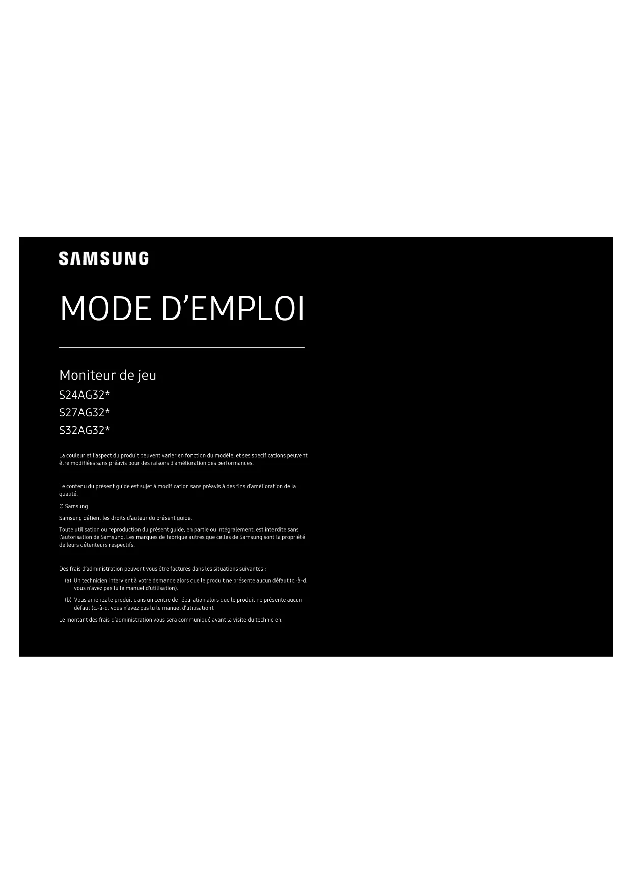 Moniteur de jeu S24AG32* S27AG32* S32AG32* La couleur et l’aspect du produit peuvent varier en fonction du modèle, et ses spécications peuvent être modiées sans préavis pour des raisons d’amélioration des performances. Le contenu du présent guide est sujet à modication sans préavis à des ns d’amélioration de la qualité. © Samsung Samsung détient les droits d’auteur du présent guide. Toute utilisation ou reproduction du présent guide, en partie ou intégralement, est interdite sans l’autorisation de Samsung. Les marques de fabrique autres que celles de Samsung sont la propriété de leurs détenteurs respectifs. Des frais d’administration peuvent vous être facturés dans les situations suivantes : (a) Un technicien intervient à votre demande alors que le produit ne présente aucun défaut (c.-à-d. vous n’avez pas lu le manuel d’utilisation). (b) Vous amenez le produit dans un centre de réparation alors que le produit ne présente aucun défaut (c.-à-d. vous n’avez pas lu le manuel d’utilisation). Le montant des frais d’administration vous sera communiqué avant la visite du technicien.2 Avant utilisation du produit Consignes de sécurité 4 Électricité et sécurité 4 Installation 5 Fonctionnement 6 Nettoyage 8 Position correcte lors de l’utilisation du produit 8 Préparatifs Installation 9 Fixation du socle 9 Précautions lors du déplacement du produit 10 Vérication de l’espace autour du produit 11 Ajustement de l’inclinaison et de la hauteur du produit 11 Rotation du produit 12 Verrou antivol 13 Spécications du kit de montage mural (VESA) 13 Panneau de conguration 14 Connexion et utilisation d’un périphérique source À lire avant de connecter le produit. 15 Ports 15 Branchement et utilisation d’un PC 16 Branchement par câble HDMI 16 Connexion à l’aide d’un câble HDMI-DVI 16 Connexion à l’aide d’un câble DP 16 Connexion à un casque ou à des écouteurs 16 Branchement de l’alimentation 17 Regroupement des câbles connectés 17 Dénition de la résolution optimale 18 Menu Jeu 19 Image 21 Afch. à l’écran 23 Système 23 Information 25 Installation du logiciel Easy Setting Box 26 Restrictions et problèmes relatifs à l’installation 26 Caractéristiques du système 26 Installation de pilote 26 Table des matières3 Guide de dépannage Conditions requises avant de contacter le Centre de service clientèle Samsung 27 Diagnostic du produit (Problème d’écran) 27 Vérication de la résolution et de la fréquence 27 Vériez les éléments suivants : 27 Questions & réponses 30 Caractéristiques techniques Général 31 Tableau des modes de signal standard 33 Annexe Prise en charge des frais de service (imputables aux clients) 35 Produit non défectueux 35 Dommage provoqué par le client 35 Autres cas 35 FreeSync (pour carte graphique AMD) 36 WEEE 37 Les bons gestes de mise au rebut de ce produit (Déchets d’équipements électriques et électroniques) 37 Table des matières4
