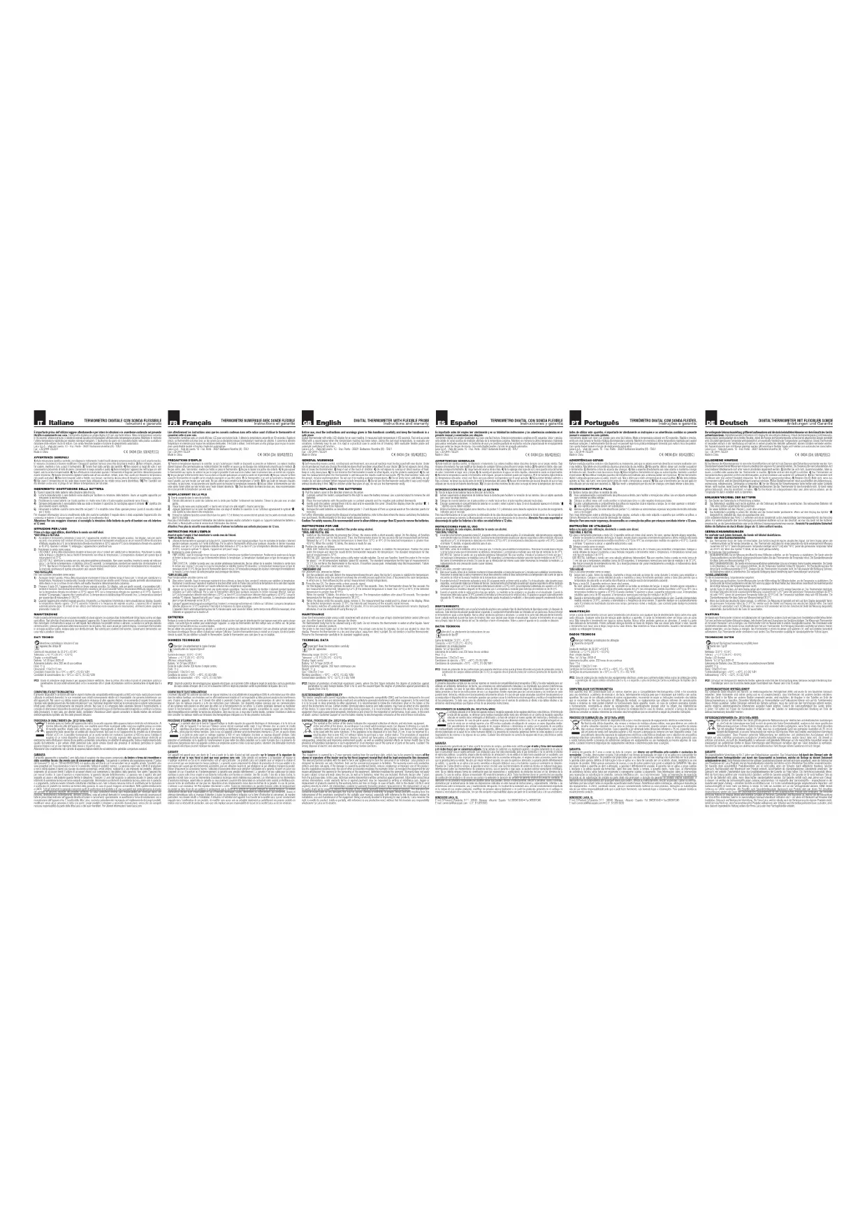Le présent dispositif est conforme aux normes en vigueur relatives à la compatibilité électromagnétique (CEM) et a été réalisé pour être utilisé dans les milieux familiaux: ses émissions sont en effet extrêmement réduites et il est improbable qu’elles puissent produire des interférences avec d’autres appareils. Au cas où il devrait être utilisé à proximité d’autres appareils, nous recommandons de suivre les indications figurant dans les tableaux présents à la fin des instructions pour l’utilisation. Des dispositifs mobiles spéciaux pour les communications et des systèmes radio peuvent en effet avoir des effets sur le fonctionnement de cet article. Si d’autres anomalies devraient se manifester durant le fonctionnement, nous conseillons d’éloigner le dispositif d’éventuels autres appareils susceptibles de causer une interférence électromagnétique et de contrôler la reprise des prestations. Dans tous les cas, si vous avez d’autres doutes, contacter l’Assistance clients ou bien consulter les tableaux relatifs aux émissions électromagnétiques indiquées à la fin des présentes instructions PROCÉDURE D’ÉLIMINATION (Dir. 2012/19/Eu-WEEE) Le symbole placé sur le fond de l’appareil indique la récolte séparée des appareils électriques et électroniques. A la fin de la vie utile de l’appareil, il ne faut pas l’éliminer comme déchet municipal solide mixte; il faut l’éliminer chez un centre de récolte spécifique situé dans votre zone ou bien le rendre au distributeur au moment de l’achat d’un nouveau appareil du même type et prévu pour les mêmes fonctions. Dans le cas où l’appareil à éliminer serait de dimensions inférieures à 25 cm, on peut le rendre à un point de vente ayant un métrage supérieur à 400 m² sans l’obligation d’acheter un nouveau dispositif similaire. Cette procédure de récolte séparée des appareils électriques et électroniques se réalise dans une vision d’une politique de sauvegarde, protection et amélioration de la qualité de l’environnement et pour éviter des effets potentiels sur la santé humaine dus à la présence de substances dangereuses dans ces appareils ou bien à un emploi non autorisé d’elles ou de leurs parties. Attention! Une élimination incorrecte des appareils électriques pourrait impliquer des pénalités. GARANTIE Cet appareil est garanti pour une durée de 2 ans à partir de la date d’achat qui doit apparaître sur le tampon et la signature du revendeur et sur le reçu fiscal ci-joint que vous garderez avec soin. Cette période est conforme à la législation en vigueur et s’applique seulement au cas où le consommateur soit un sujet particulier. Les produits Laica sont projetés pour un emploi à la maison et on ne permet pas son emploi dans les locaux publiques. La garantie couvre uniquement les défauts de production et n’est pas valable si les dommages sont causés par des événements accidentels, par une utilisation incorrecte, par négligence ou par utilisation impropre du produit. Utiliser uniquement les accessoires fournis; l’utilisation d’accessoires divers peut entraîner l’annulation de la garantie. N’ouvrir en aucun cas l’appareil; en cas d’ouverture ou d’endommagement, la garantie sera annulée définitivement. La garantie n’est pas valide pour les pièces soumises à usure suite à leur emploi et aux batteries lorsqu’elles sont fournies en dotation. Une fois écoulés 2 ans dès la date d’achat, la garantie s’échoit; dans ce cas les interventions d’assistance technique seront réalisées sous paiement. Les informations sur les interventions d’assistance technique, soient elles en garantie ou sous paiement, pourront être demandées en contactant notre société à info@laica.com. Aucune forme de contribution est due pour les réparations et les remplacements inclus dans les termes de la garantie. En cas de pannes, s’adresser à son revendeur; NE PAS expédier directement à LAICA. Toutes les interventions en garantie (incluses celles de remplacement du produit ou bien d’une de ses parties) ne prolongeront pas la durée de la période de garantie originale du produit remplacé. La maison constructrice décline toute responsabilité en cas d’éventuels dommages causés, directement ou indirectement, aux personnes, choses et animaux domestiques suite au manque d’attention à toutes les prescriptions indiquées sur le livret d’instruction et concernant, de manière particulière, les conseils relatifs à l’installation, l’utilisation et l’entretien de l’appareil. Il est faculté de la société Laica, qui est constamment engagée dans l’amélioration de ses produits, de modifier sans aucun avis au préalable totalement ou partiellement ses propres produits en relation avec la nécessité de production, sans que cela implique aucune responsabilité de la part de la société Laica ou de ses vendeurs. Before use, read the instructions and warnings given in this handbook carefully and keep the handbook in a safe place. Digital thermometer with wide LCD-display for an easy reading. It measures body temperature in 60 seconds. Fast and accurate fitted with a sound signal when the temperature reading has been taken. Stores the last read temperature, to evaluate any variations. Extremely easy to use, it is kept in a practical case to avoid risk of breaking. With washable flexible probe and automatic switching-off function. Laica S.p.A. - Viale del Lavoro, 10 - Fraz. Ponte - 36021 Barbarano Vicentino (VI) - ITALY Fax: +39-0444-795324 Made in China GENERAL WARNINGS 1) Self-measuring means control, not diagnosis and treatment, any unusual readings must be discussed with your doctor. Under no circumstances must you change the medicine doses that have been prescribed by your doctor. 2) Do not squeeze, bend, drop, bite or break the thermometer. 3) Keep it out of the reach of children. 4) Do not expose
