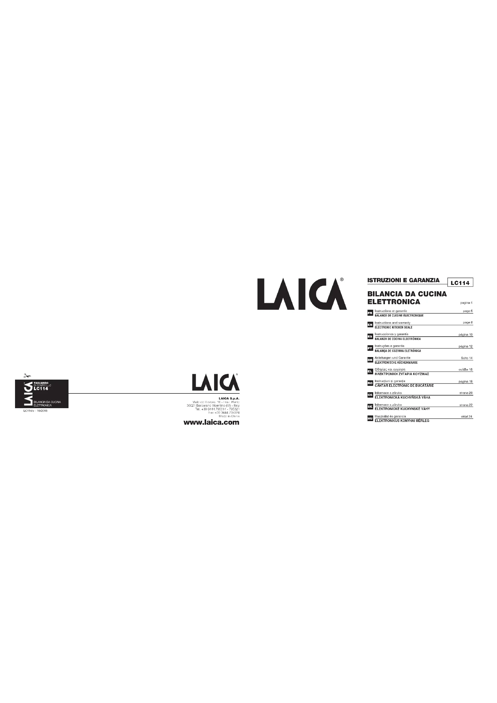 La notice d'utilisation doit être considérée comme partie du produit et doit être conservée pendant tout le cycle de vie de ce dernier. En cas de cession de l'appareil à un autre propriétaire, remettre également toute la documentation. Pour une utilisation sure et correcte du produit, l'utilisateur est tenu de lire attentivement les instructions et avertissements contenus dans le manuel car ils fournissent des informations importantes concernant la sécurité et les instructions pour l'utilisation et la maintenance. En cas de perte de la notice d'utilisation ou pour obtenir plus d'informations ou de détails, contacter l'entreprise à l'adresse figurant ci-dessous : Laica S.p.A. Viale del Lavoro, 10 – Fraz. Ponte – 36021 Barbarano Vicentino (VI) – Italie - Tél. +39 0444.795314 - 795321 - Fax +39 0444.795324 - www.laica.com