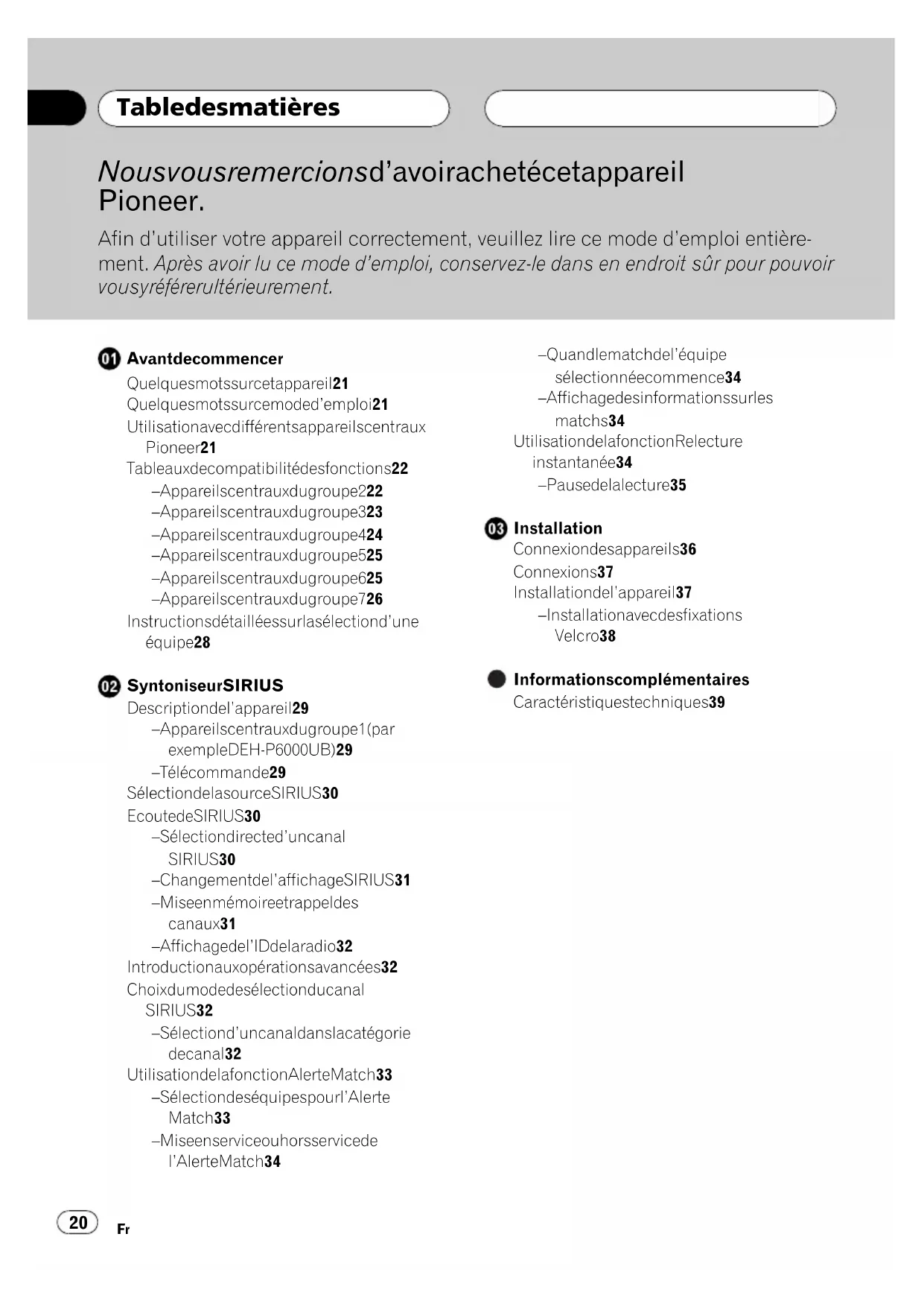 English AppendixNous vous remercions d’avoir acheté cet appareil Pioneer. Afin d’utiliser votre appareil correctement, veuillez lire ce mode d’emploi entière- ment. Après avoir lu ce mode d’emploi, conservez-le dans en endroit sûr pour pouvoir vous y référer ultérieurement. Avant de commencer Quelques mots sur cet appareil 21 Quelques mots sur ce mode d’emploi 21 Utilisation avec différents appareils centraux Pioneer 21 Tableaux de compatibilité des fonctions 22 – Appareils centraux du groupe 2 22 – Appareils centraux du groupe 3 23 – Appareils centraux du groupe 4 24 – Appareils centraux du groupe 5 25 – Appareils centraux du groupe 6 25 – Appareils centraux du groupe 7 26 Instructions détaillées sur la sélection d’une équipe 28 Syntoniseur SIRIUS Description de l’appareil 29 – Appareils centraux du groupe 1(par exemple DEH-P6000UB) 29 – Télécommande 29 Sélection de la source SIRIUS 30 Ecoute de SIRIUS 30 – Sélection directe d’un canal SIRIUS 30 – Changement de l’affichage SIRIUS 31 – Mise en mémoire et rappel des canaux 31 – Affichage de l’ID de la radio 32 Introduction aux opérations avancées 32 Choix du mode de sélection du canal SIRIUS 32 – Sélection d’un canal dans la catégorie de canal 32 Utilisation de la fonction Alerte Match 33 – Sélection des équipes pour l’Alerte Match 33 – Mise en service ou hors service de l’Alerte Match 34 – Quand le match de l’équipe sélectionnée commence 34 – Affichage des informations sur les matchs 34 Utilisation de la fonction Relecture instantanée 34 – Pause de la lecture 35 Installation Connexion des appareils 36 Connexions 37 Installation de l’appareil 37 – Installation avec des fixations Velcro 38 Informations complémentaires Caractéristiques techniques 39 Table des matières