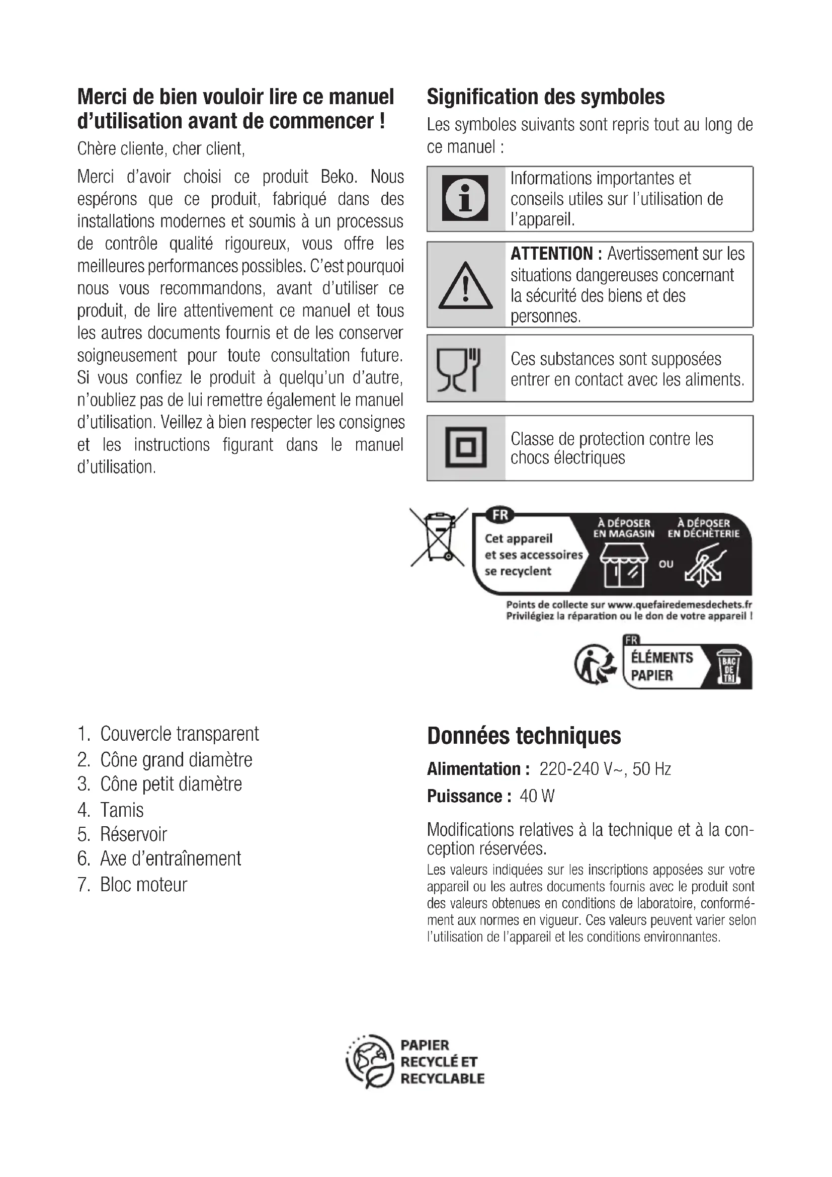 Diese Garantiezusage ist nur gültig innerhalb der Bundesrepublik Deutschland Garantiebedingungen - Beko – Version Februar 2021Merci de bien vouloir lire ce manuel d’utilisation avant de commencer ! Chère cliente, cher client, Merci d’avoir choisi ce produit Beko. Nous espérons que ce produit, fabriqué dans des installations modernes et soumis à un processus de contrôle qualité rigoureux, vous offre les meilleures performances possibles. C’est pourquoi nous vous recommandons, avant d’utiliser ce produit, de lire attentivement ce manuel et tous les autres documents fournis et de les conserver soigneusement pour toute consultation future. Si vous confiez le produit à quelqu’un d’autre, n’oubliez pas de lui remettre également le manuel d’utilisation. Veillez à bien respecter les consignes et les instructions figurant dans le manuel d’utilisation. Signification des symboles Les symboles suivants sont repris tout au long de ce manuel : Informations importantes et conseils utiles sur l’utilisation de l’appareil. ATTENTION : Avertissement sur les situations dangereuses concernant la sécurité des biens et des personnes.Ces substances sont supposées entrer en contact avec les aliments.Classe de protection contre les chocs électriques