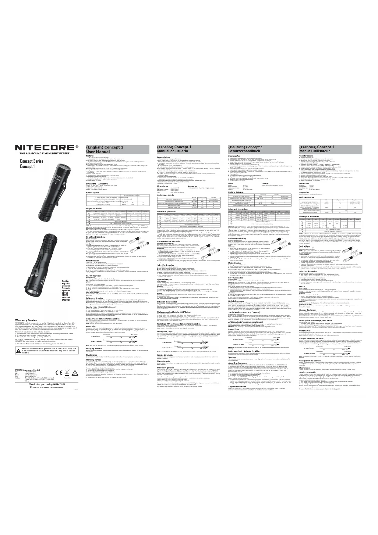 Dans le mode strobe, appuyez sur le bouton pendant plus d’une seconde pour naviguer entre “SOS-balise-strobe”. Pour quitter ces modes et revenir au dernier niveau d’éclairage utilisé, appuyez simplement sur le bouton.Système ATR Le système avancé de régulation de la température (ATR) permet à la lampe d’ajuster de façon dynamique son niveau d’éclairage en fonction de sa température interne . Note: Si la lampe Concept 1 est trop chaude, Le mode Turbo ne pourra s’activer. Remplacement des batteries Lorsque la lampe est éteinte, à chaque changement de batteries, l’indicateur lumineux clignotera pour indiquer le voltage de la batterie à 0,1V près (Pendant le signalement de la tension de la batterie, appuyez sur le bouton pour l'arrêter). Par exemple, quand le voltage est de 4,2V, l’indicateur lumineux s’allumera 4 fois, puis, après 1.5 seconde de pause, 2 nouvelles fois, avant de réactiver le dernier niveau d’éclairage utilisé. Le voltage indiqué correspond à la batterie restante: 1×18650 battery 2×CR123 batteries Note: LorsquevousutilisezdeuxCR123/RCR123,lalampedepocheindiqueseulementlatensionmoyenneentrelesdeux batteries.Changement des batteries Lorsquel’indicateurlumineuxclignoterapidement,lesbatteries/pilesontbesoind’êtreremplacéesourechargées.Silalampe devientfaibleounerépondplusauxréglages,celasignieégalementquelesbatteries/pilesdoiventêtreremplacéesou rechargées.MaintenanceTouslessixmois,leletagedoitêtreessuyéavecunchionpropreetrecouvertd’unlubriantàbasedesilicone.Service de garantieTous les produits NITECORE sont garantis pour leur qualité. Les produits défectueux peuvent être échangés par l’intermédiaire du distributeur local dans les 15 jours suivant l’achat. Après 15 jours, tous les produits NITECORE défectueux peuvent être réparés gratuitement pendant les 60 mois (5 ans) suivant l’achat. Après 60 mois, une garantie limitée s’applique, couvrant les coûts de main d’œuvre et maintenance, mais pas le coût des pièces détachées.La garantie est annulée dans les situations suivantes : 1.Le(s)produit(s)est/sontdécomposé(s),reconstruit(s)et/oumodié(s)pardespersonnesnonautorisées. 2.Le(s)produit(s)est/sontendommagéssuiteàunusageinapproprié.3.Le(s)produit(s)est/sontendommagéssuiteàdesfuitesdebatteries.Pour les dernières informations sur les produits et services NITECORE , contactez votre distributeur national NITECORE