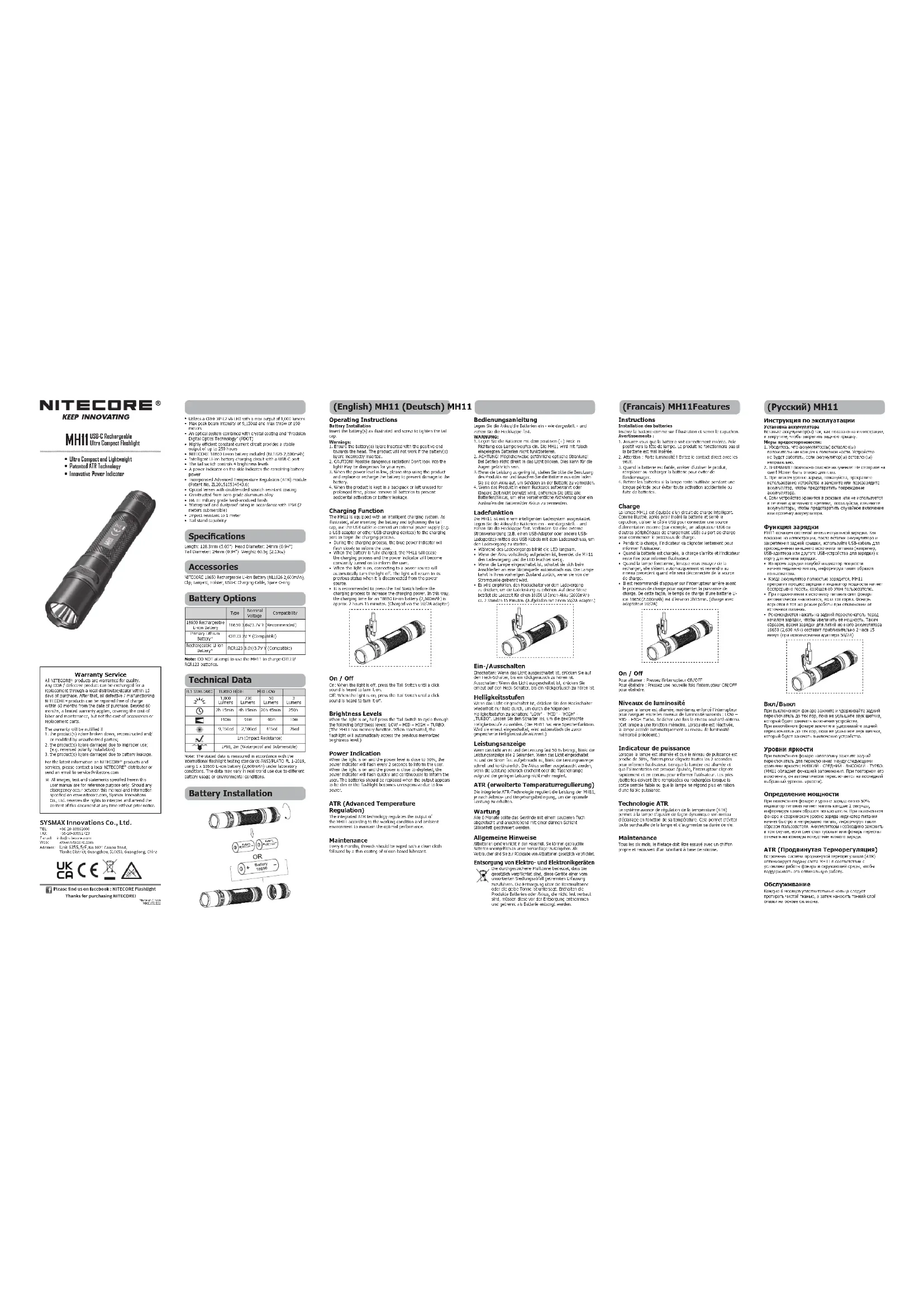 - Il est recommandé d'appuyer sur l'interrupteur arrière avant le processus de charge pour augmenter la puissance de charge. De cette façon, le temps de charge d'une batterie Li- ion 18650(2.600mAh) est d’environ 2h15min. (charge avec adaptateur 5V/2A) On / O Pour allumer : Pressez l’interrupteur ON/OFF Pour éteindre : Pressez une nouvelle fois l’interrupteur ON/OFF pour éteindre. Niveaux de luminosité Lorsque la lampe est allumée, maintenez enfoncé l’interrupteur pour naviguer entre les niveaux de luminosité suivants : LOW – MID – HIGH-Turbo. Relâcher une fois le niveau souhaité obtenu. (Cet lampe a une fonction mémoire. Lorsqu'elle est réactivée, la lampe accède automatiquement au niveau de luminosité mémorisé précédent.) Indicateur de puissance Lorsque la lampe est allumée et que le niveau de puissance est proche de 50%, l’interrupteur clignote toutes les 2 secondes pour informer l'utilisateur. Lorsque la lumière est allumée et que l'alimentation est presque épuisée, l’interrupteur clignote rapidement et en continu pour informer l'utilisateur. Les piles /batteries doivent être remplacées ou rechargées lorsque la sortie semble faible ou que la lampe ne répond plus en raison d'une faible puissance. Technologie ATR Le système avancé de régulation de la température (ATR) permet à la lampe d’ajuster de façon dynamique son niveau d’éclairage en fonction de sa température. Cela permet d’éviter toute surchaue de la lampe et d’augmenter sa durée de vie. Maintenance Tous les six mois, le letage doit être essuyé avec un chion propre et recouvert d’un lubriant à base de silicone. Warranty Service All NITECORE