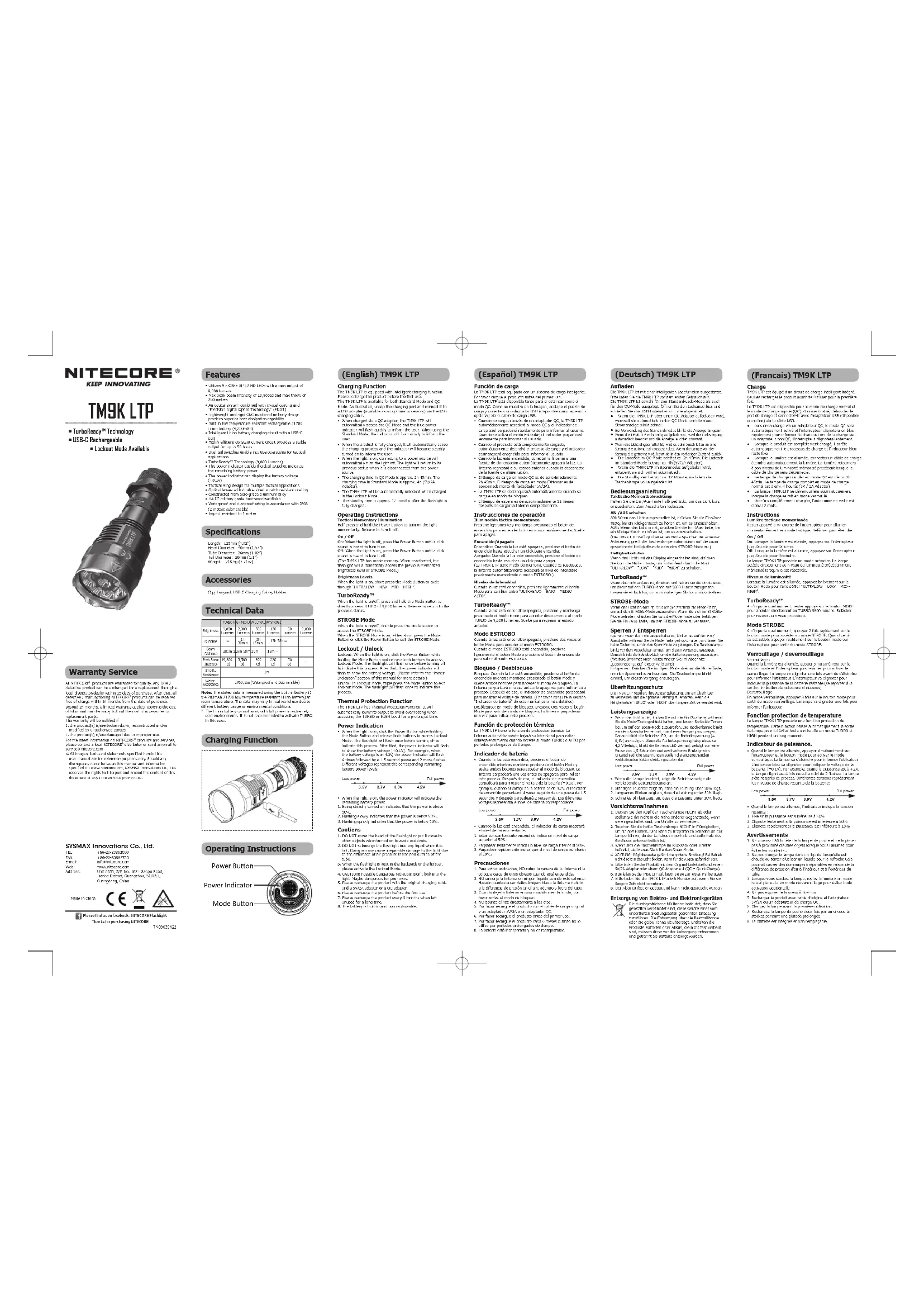 - Quand la lampe est allumée, appuyer simultanément sur l’interrupteur et le bouton mode pour activer le mode verrouillage. La lampe sa s’éteindre pour informer l’utilisateur. L’indicateur bleu va clignoter pour indiquer le voltage de la batterie. (±0.1V). Par exemple, quand la puissance est à 4.2V, lalampeclignotera4foisdesuitesuivide2ashes.Lalampes’éteintaprèsceprocess.Diérentestensionsreprésententles niveaux de charge restants de la batterie:• Quand la lampe est allumée, l’indicateur indique la tension restante : 1. Fixe sir la puissance est supérieure à 50%2. Clignote lentement si la puissance est inférieure à 50%3. Clignote rapidement si la puissance est inférieure à 10% Avertissements 1.NEcouvrezPASlatêtedelalampedepocheetnelaplacezpas à proximité d'autres objets lorsque vous l'allumez pour éviter les accidents..2. Ne pas plonger la lampe dans un liquide lorsqu'elle est chaude ou tenter d'utiliser un liquide pour la refroidir. Cela pourrait causer des dommages irréparables en raison de la diérencedepressiond'airàl'intérieuretàl'extérieurdutube.3. Lorsque vous stockez la lampe, réglez la lumière en mode bas et placez-la en mode de verrouillage pour éviter toute activation accidentelle4. NE pas exposer le faisceau à l’oeil nu5. Recharger le produit avec cable d’origine et l’adaptateur 5V/2A ou un adaptateur de charge QC .6. Chargez la lampe avant la première utilisation. 7. Rechargez la lampe de poche deux fois par an si vous la stockez pendant une période prolongée.8. La batterie est intégrée et non remplaçable. Low power Full power3.5V 3.7V 3.9V 4.2V Power Button Power Indicator Mode Button All NITECORE products are warranted for quality. Any DOA / defective product can be exchanged for a replacement through a local distributor/dealer within 15 days of purchase. After that, all defective / malfunctioning NITECORE products can be repaired free of charge within 24 months from the date of purchase. Beyond 24 months, a limited warranty applies, covering the cost of labor and maintenance, but not the cost of accessories or replacement parts.Thewarrantywillbenulliedif1. the product(s) is/are broken down, reconstructed and/or modiedbyunauthorizedparties;2. the product(s) is/are damaged due to improper use.For the latest information on NITECORE products and services, please contact a local NITECORE distributor or send an email to service@nitecore.com※Allimages,textsandstatementsspeciedhereinthisuser manual are for reference purposes only. Should any discrepancy occur between this manual and information speciedonwww.nitecore.com,SYSMAXInnovationsCo.,Ltd.reserves the rights to interpret and amend the content of this document at any time without prior notice
