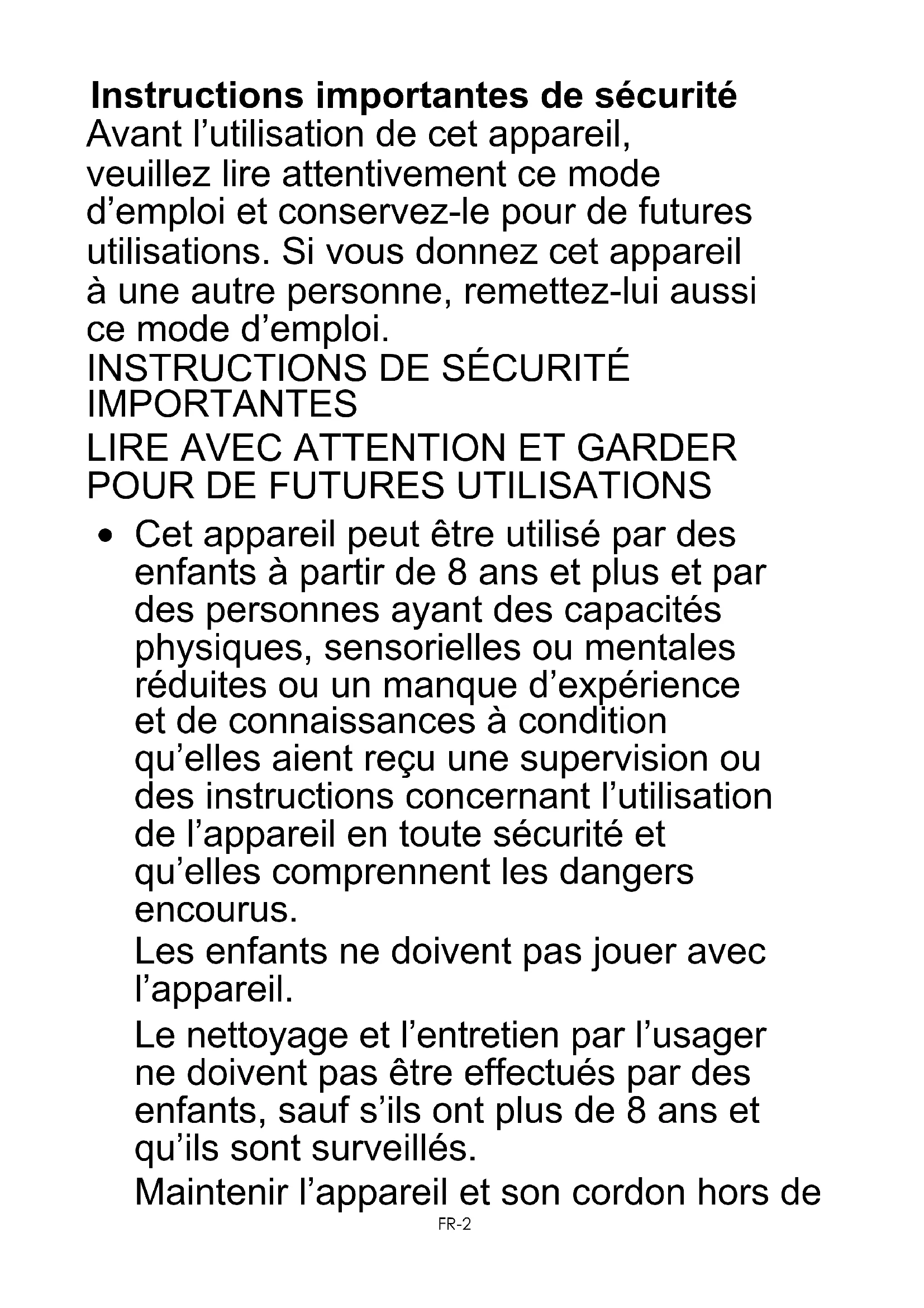 Cet appareil peut être utilisé par des enfants à partir de 8 ans et plus et par des personnes ayant des capacités physiques, sensorielles ou mentales réduites ou un manque d’expérience et de connaissances à condition qu’elles aient reçu une supervision ou des instructions concernant l’utilisation de l’appareil en toute sécurité et qu’elles comprennent les dangers encourus. Les enfants ne doivent pas jouer avec l’appareil. Le nettoyage et l’entretien par l’usager ne doivent pas être effectués par des enfants, sauf s’ils ont plus de 8 ans et qu’ils sont surveillés. Maintenir l’appareil et son cordon hors deFR-3