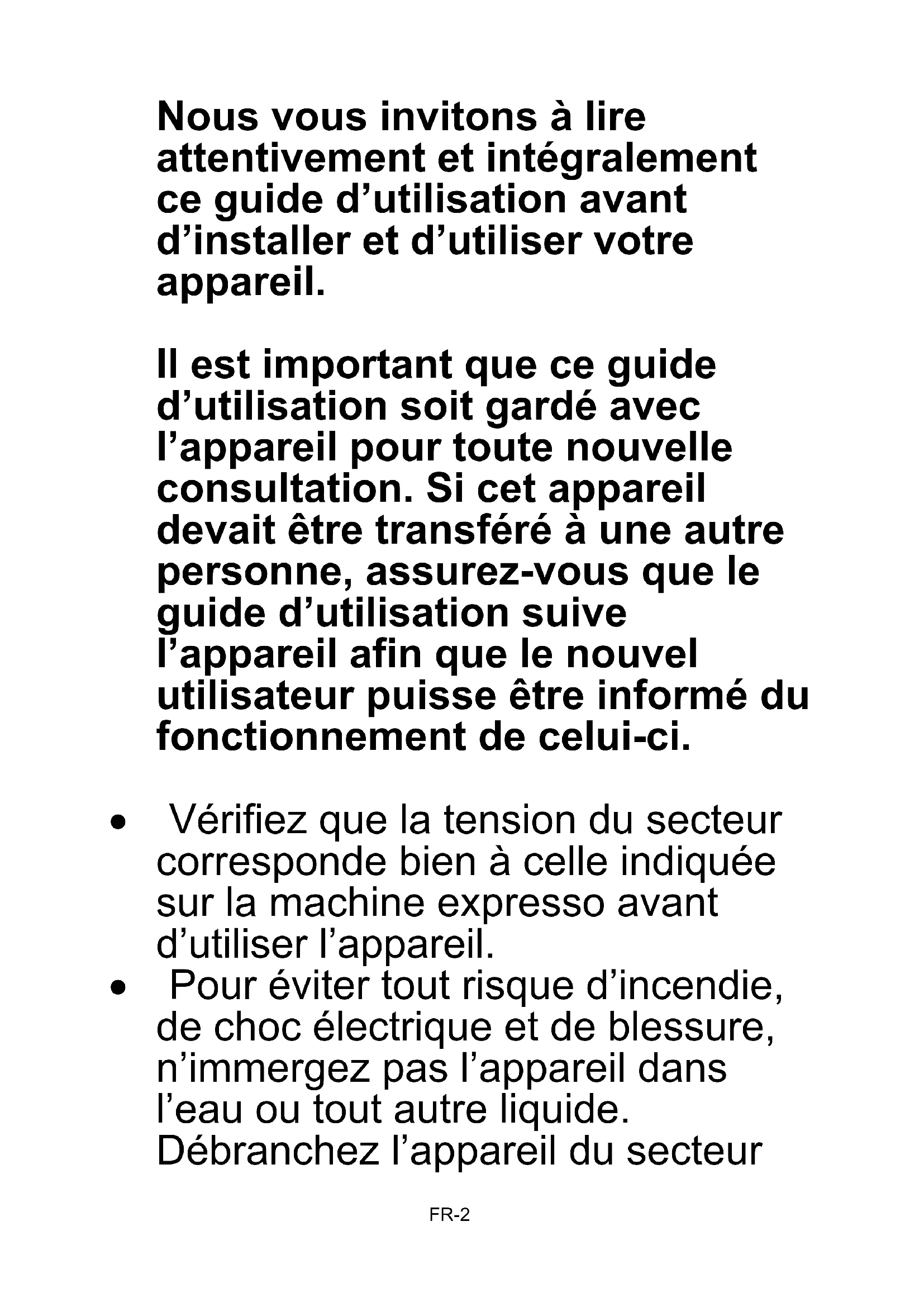 Nous vous invitons à lire attentivement et intégralement ce guide d’utilisation avant d’installer et d’utiliser votre appareil. Il est important que ce guide d’utilisation soit gardé avec l’appareil pour toute nouvelle consultation. Si cet appareil devait être transféré à une autre personne, assurez-vous que le guide d’utilisation suive l’appareil afin que le nouvel utilisateur puisse être informé du fonctionnement de celui-ci.