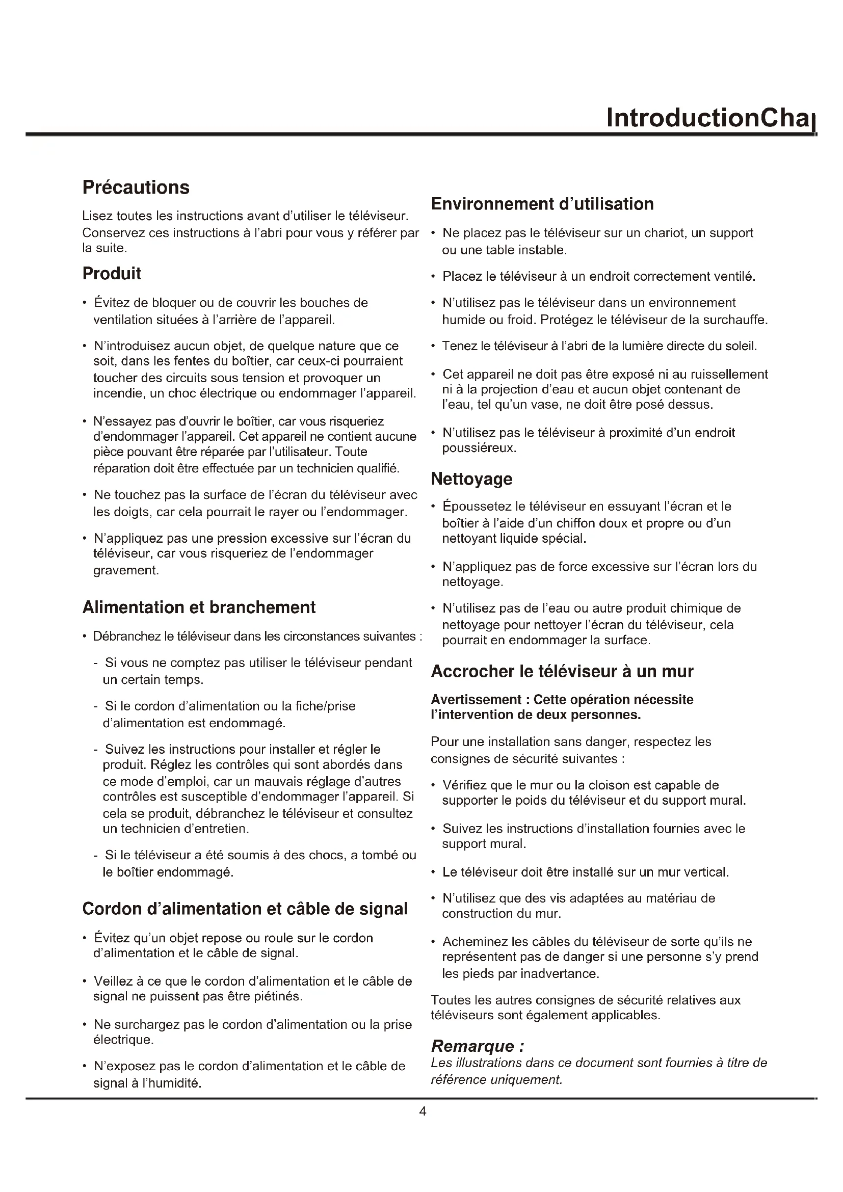 IntroductionChapitre 1 Précautions Lisez toutes les instructions avant d’utiliser le téléviseur. Conservez ces instructions à l’abri pour vous y référer par la suite. Produit