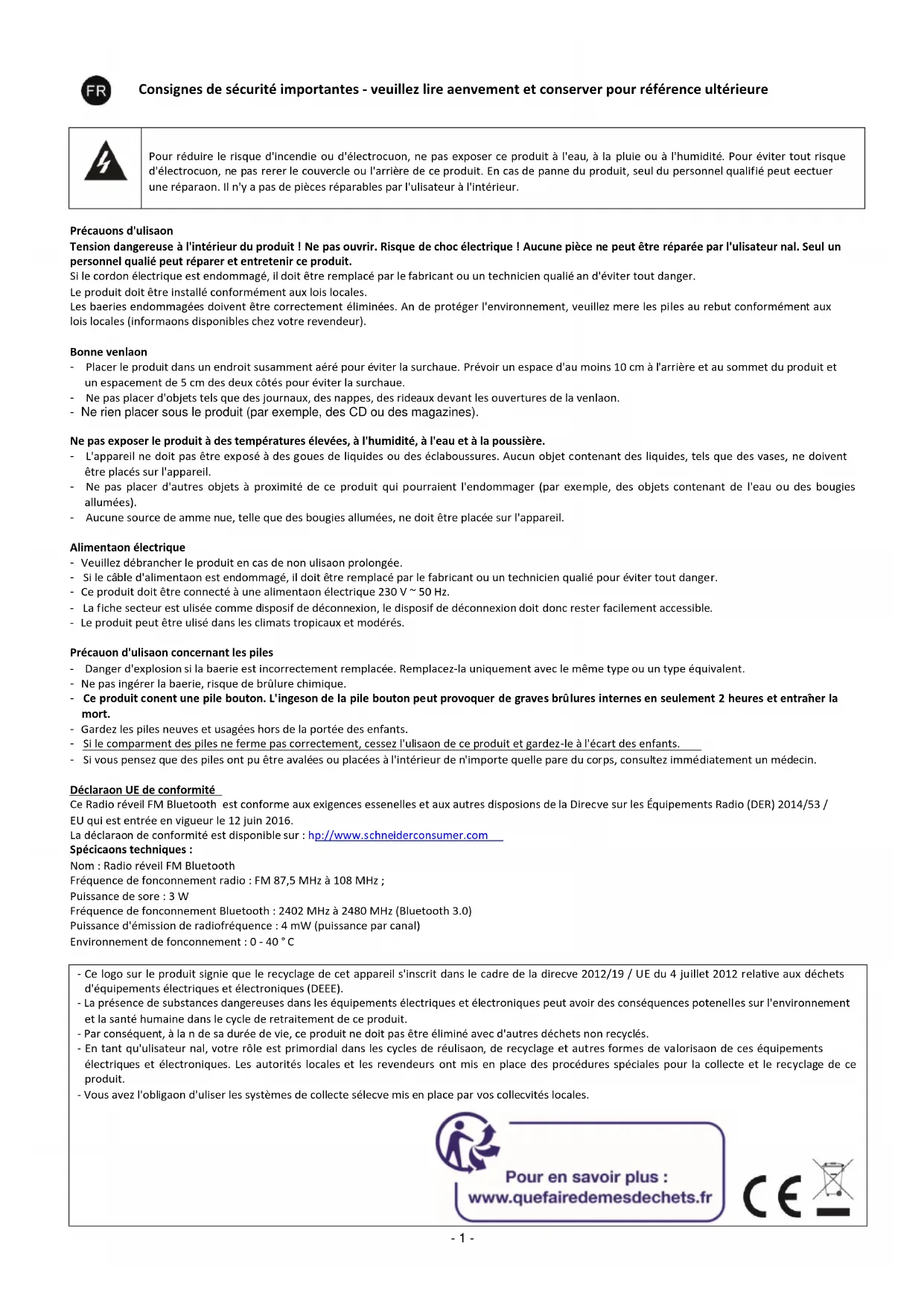Précautions d'utilisation Tension dangereuse à l'intérieur du produit ! Ne pas ouvrir. Risque de choc électrique ! Aucune pièce ne peut être réparée par l'utilisateur final. Seul un personnel qualifié peut réparer et entretenir ce produit. Si le cordon électrique est endommagé, il doit être remplacé par le fabricant ou un technicien qualifié afin d'éviter tout danger. Le produit doit être installé conformément aux lois locales. Les batteries endommagées doivent être correctement éliminées. Afin de protéger l'environnement, veuillez mettre les piles au rebut conformément aux lois locales (informations disponibles chez votre revendeur). Bonne ventilation - Placer le produit dans un endroit suffisamment aéré pour éviter la surchauffe. Prévoir un espace d'au moins 10 cm à l'arrière et au sommet du produit et un espacement de 5 cm des deux côtés pour éviter la surchauffe. - Ne pas placer d'objets tels que des journaux, des nappes, des rideaux devant les ouvertures de la ventilation. - Ne rien placer sous le produit (par exemple, des CD ou des magazines). Ne pas exposer le produit à des températures élevées, à l'humidité, à l'eau et à la poussière. - L'appareil ne doit pas être exposé à des gouttes de liquides ou des éclaboussures. Aucun objet contenant des liquides, tels que des vases, ne doivent être placés sur l'appareil. - Ne pas placer d'autres objets à proximité de ce produit qui pourraient l'endommager (par exemple, des objets contenant de l'eau ou des bougies allumées). - Aucune source de flamme nue, telle que des bougies allumées, ne doit être placée sur l'appareil. Alimentation électrique - Veuillez débrancher le produit en cas de non utilisation prolongée. - Si le câble d'alimentation est endommagé, il doit être remplacé par le fabricant ou un technicien qualifié pour éviter tout danger. - Ce produit doit être connecté à une alimentation électrique 230 V ~ 50 Hz. - La fiche secteur est utilisée comme dispositif de déconnexion, le dispositif de déconnexion doit donc rester facilement accessible. - Le produit peut être utilisé dans les climats tropicaux et modérés. Précaution d'utilisation concernant les piles - Danger d'explosion si la batterie est incorrectement remplacée. Remplacez-la uniquement avec le même type ou un type équivalent. - Ne pas ingérer la batterie, risque de brûlure chimique. - Ce produit contient une pile bouton. L'ingestion de la pile bouton peut provoquer de graves brûlures internes en seulement 2 heures et entraîner la mort. - Gardez les piles neuves et usagées hors de la portée des enfants. - Si le compartiment des piles ne ferme pas correctement, cessez l'utilisation de ce produit et gardez-le à l'écart des enfants. - Si vous pensez que des piles ont pu être avalées ou placées à l'intérieur de n'importe quelle partie du corps, consultez immédiatement un médecin. Déclaration UE de conformité Ce Radio réveil FM Bluetooth est conforme aux exigences essentielles et aux autres dispositions de la Directive sur les Équipements Radio (DER) 2014/53 / EU qui est entrée en vigueur le 12 juin 2016. La déclaration de conformité est disponible sur : http://www.schneiderconsumer.com Spécifications techniques : Nom : Radio réveil FM Bluetooth Fréquence de fonctionnement radio : FM 87,5 MHz à 108 MHz ; Puissance de sortie : 3 W Fréquence de fonctionnement Bluetooth : 2402 MHz à 2480 MHz (Bluetooth 3.0) Puissance d'émission de radiofréquence : 4 mW (puissance par canal) Environnement de fonctionnement : 0 - 40 °C - Ce logo sur le produit signifie que le recyclage de cet appareil s'inscrit dans le cadre de la directive 2012/19 / UE du 4 juillet 2012 relative aux déchets d'équipements électriques et électroniques (DEEE). - La présence de substances dangereuses dans les équipements électriques et électroniques peut avoir des conséquences potentielles sur l'environnement et la santé humaine dans le cycle de retraitement de ce produit. - Par conséquent, à la fin de sa durée de vie, ce produit ne doit pas être éliminé avec d'autres déchets non recyclés. - En tant qu'utilisateur final, votre rôle est primordial dans les cycles de réutilisation, de recyclage et autres formes de valorisation de ces équipements électriques et électroniques. Les autorités locales et les revendeurs ont mis en place des procédures spéciales pour la collecte et le recyclage de ce produit. - Vous avez l'obligation d'utiliser les systèmes de collecte sélective mis en place par vos collectivités locales.- 2 -