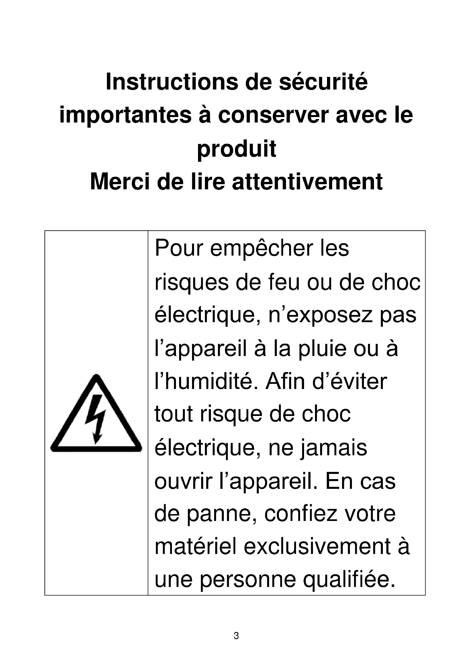 Pour empêcher les risques de feu ou de choc électrique, n’exposez pas l’appareil à la pluie ou à l’humidité. Afin d’éviter tout risque de choc électrique, ne jamais ouvrir l’appareil. En cas de panne, confiez votre matériel exclusivement à une personne qualifiée.4 Aucune pièce de cet appareil n’est susceptible d’être réparée par l’utilisateur. ATTENTION ! Appareil sous tension dangereuse ! Ne pas ouvrir. Risque de choc électrique ! Aucune pièce n’est susceptible d’être réparée par l’utilisateur. Laissez à des personnes qualifiées le soin d’assurer l’entretien de votre appareil. Si le câble d’alimentation est endommagé, il doit être remplacé par le fabricant, son service après –5 vente ou des personnes de qualification similaire afin d’éviter un danger. Le produit doit être installé en accord avec les réglementations nationales. Les piles ou batteries usagées doivent être mises au rebut de façon sûre. Les déposer dans des bacs de collecte prévus (renseignez-vous auprès de votre revendeur) afin de protéger l'environnement.6 Les piles de la télécommande (non fournies) ne doivent pas être exposées à une chaleur excessive telle que celle du soleil ou d’un feu. Bonne disposition de l’appareil - Placez l’appareil sur une surface plane, rigide et stable. Ne pas placer l’appareil sur un tapis. - Ne posez pas votre appareil au-dessus d’un autre dispositif qui risquerait d’entraîner une surchauffe (par exemple, un récepteur ou un amplificateur).7 - Ne placez rien en dessous de l’appareil (par exemple, des CD ou des magazines). Espace de ventilation - Placez l’appareil dans un endroit suffisamment ventilé afin d’éviter une accumulation de chaleur interne. Laissez au moins un espace de 10cm à l’arrière et au-dessus de l’appareil ainsi qu’un espace de 5cm sur les côtés afin d’éviter toute surchauffe. - Ne pas obstruer les ouvertures de ventilation par des objets tels que8 des journaux, nappes, rideau, etc… Préservez l’appareil des températures élevées, de l’humidité, de l’eau et de la poussière. - L’appareil ne doit pas être exposé à des égouttements d’eau ou des éclaboussures. Aucun objet rempli de liquide tel que des vases ne doit être placé sur l’appareil. - Ne placez pas d’objets susceptibles d’endommager votre appareil près de ce dernier (par9 exemple, objets remplis de liquide ou bougies allumées). - Ne pas placer sur l'appareil de sources de flammes nues telles que des bougies allumées. Alimentation électrique - Veuillez débrancher le produit en cas de non-utilisation prolongée. - Si le cordon d’alimentation est endommagé, celui-ci doit être remplacé par le fabricant, son service après-vente ou des personnes qualification similaire afin d’éviter un danger.10 - Cet appareil doit être relié à un réseau électrique 100-240V ~ 50/60Hz. - La prise d’alimentation réseau est utilisée comme dispositif de déconnexion, ainsi la prise d’alimentation doit demeurer aisément accessible après installation du produit. - L’appareil est destiné à être utilisé sous un climat tempéré uniquement. - L’appareil doit être connecté à un socle du réseau d’alimentation muni d’une connexion reliée à la terre.11 AVERTISSEMENT Ne jamais placer un téléviseur à un emplacement instable. Un téléviseur peut tomber, en causant des blessures ou la mort d'une personne. De nombreuses blessures, en particulier dans le cas d'enfants, peuvent être évitées en prenant des précautions simples comme : - L’utilisation de meubles ou de socles recommandés par le fabricant du téléviseur. - L’utilisation exclusive de mobilier pouvant supporter le poids du téléviseur en toute sécurité.12 - S'assurer que le téléviseur ne dépasse pas du rebord du mobilier sur lequel elle est placée. - Ne jamais placer le téléviseur sur un meuble haut (par exemple, les armoires ou les bibliothèques) sans fixer à la fois le meuble et le téléviseur sur un support approprié. - Ne pas placer le téléviseur sur du tissu ou d'autres matériaux pouvant être places entre le téléviseur et le meuble. - Expliquer aux enfants les dangers auxquels ils s'exposent en grimpant sur le meuble pour13 atteindre le téléviseur ou ses commandes. - Au cas où cet ensemble télévision devait être déplacé à un autre endroit, veuillez garder à l'esprit et appliquer les instructions de sécurité susmentionnées. UE Déclaration de conformité Ce dispositif de télévision respecte les exigences essentielles et les autres dispositions relatives à la directive 2014/35/EU & 2014/30/EU et de la directive sur les équipements radio (RED) 2014/53/EU qui est entrée en vigueur le 12 juin 2016. La déclaration de conformité est disponible sur le site: http://www.schneiderconsumer.com