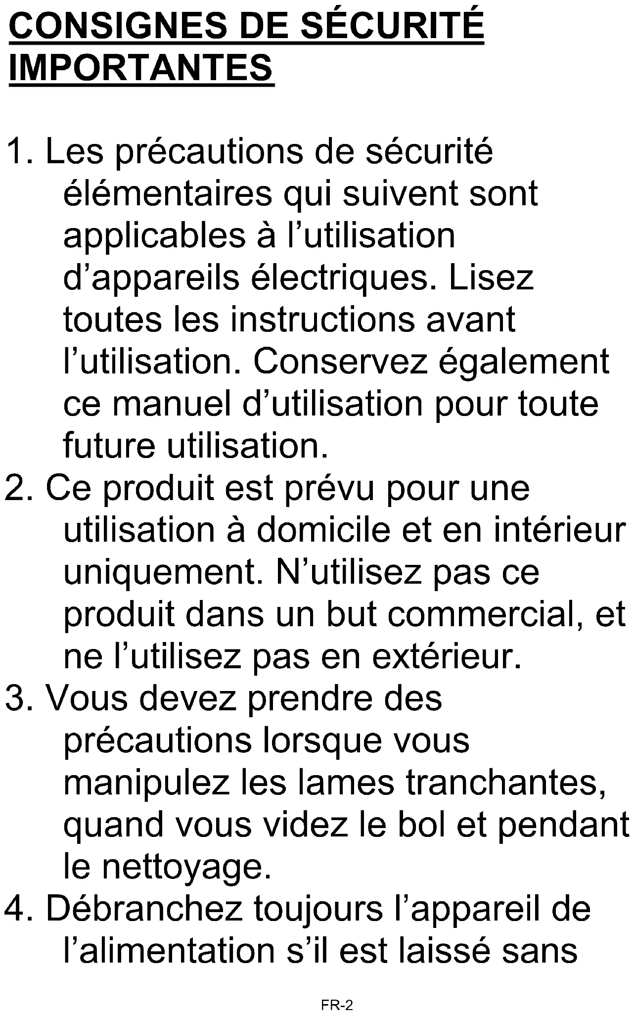 élémentaires qui suivent sont applicables à l’utilisation d’appareils électriques. Lisez toutes les instructions avant l’utilisation. Conservez également ce manuel d’utilisation pour toute future utilisation.
