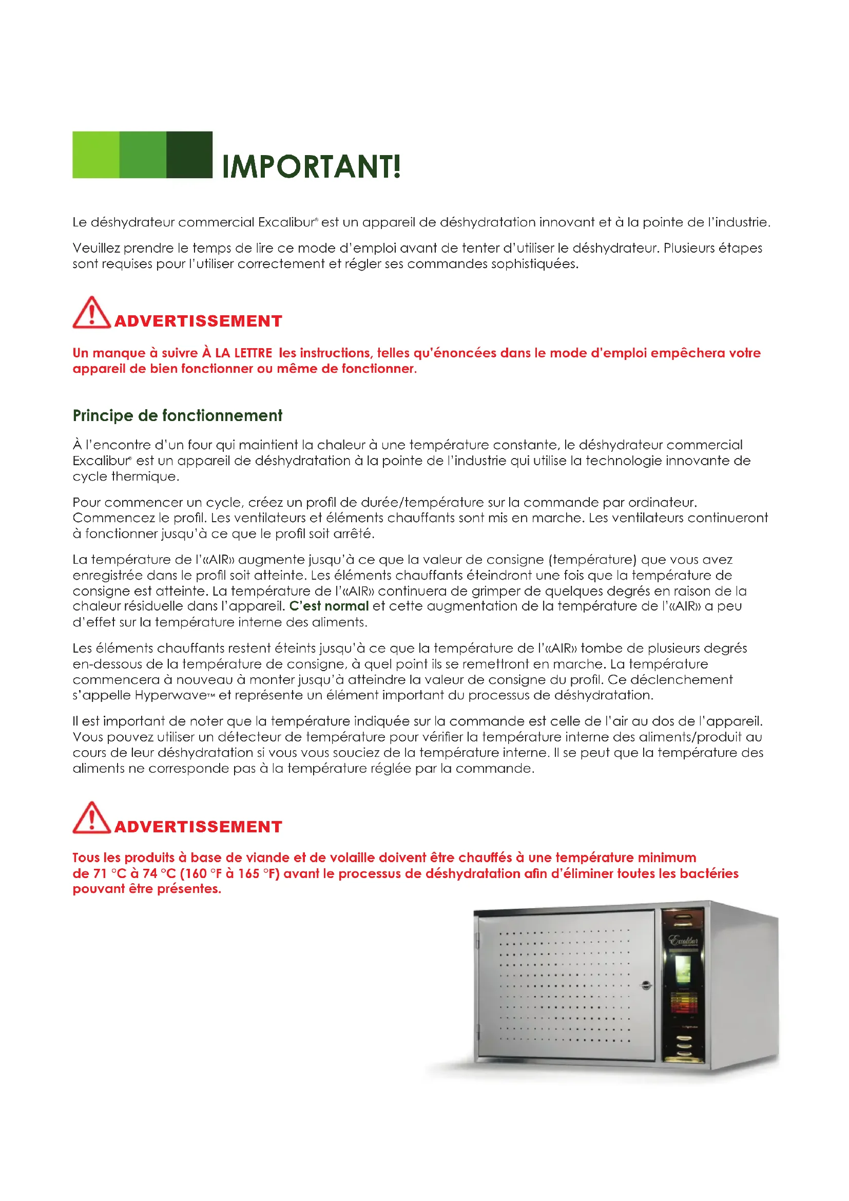 est un appareil de déshydratation à la pointe de l’industrie qui utilise la technologie innovante de cycle thermique. Pour commencer un cycle, créez un prol de durée/température sur la commande par ordinateur. Commencez le prol. Les ventilateurs et éléments chauffants sont mis en marche. Les ventilateurs continueront à fonctionner jusqu’à ce que le prol soit arrêté. La température de l’«AIR» augmente jusqu’à ce que la valeur de consigne (température) que vous avez enregistrée dans le prol soit atteinte. Les éléments chauffants éteindront une fois que la température de consigne est atteinte. La température de l’«AIR» continuera de grimper de quelques degrés en raison de la chaleur résiduelle dans l’appareil. C’est normal et cette augmentation de la température de l’«AIR» a peu d’effet sur la température interne des aliments. Les éléments chauffants restent éteints jusqu’à ce que la température de l’«AIR» tombe de plusieurs degrés en-dessous de la température de consigne, à quel point ils se remettront en marche. La température commencera à nouveau à monter jusqu’à atteindre la valeur de consigne du prol. Ce déclenchement s’appelle Hyperwave™ et représente un élément important du processus de déshydratation. Il est important de noter que la température indiquée sur la commande est celle de l’air au dos de l’appareil. Vous pouvez utiliser un détecteur de température pour vérier la température interne des aliments/produit au cours de leur déshydratation si vous vous souciez de la température interne. Il se peut que la température des aliments ne corresponde pas à la température réglée par la commande. Tous les produits à base de viande et de volaille doivent être chauffés à une température minimum de 71 °C à 74 °C (160 °F à 165 °F) avant le processus de déshydratation an d’éliminer toutes les bactéries pouvant être présentes. ADVERTISSEMENT
