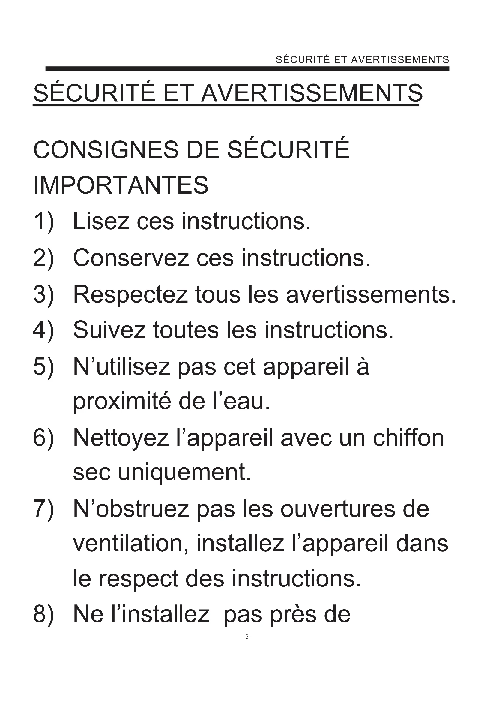 soit pas piétiné ou pincé, particulièrement au niveau des prises, des prises murales et au point depuis lequel ils sortent de l’appareil. 11) Utilisez uniquement les accessoires spécifiés par le fabricant. 12) Débranchez l’appareil pendant les orages, ou si vous prévoyez de ne pas l’utiliser pendant une durée prolongée. 13) Confiez toutes les réparations au personnel qualifié. Faites réparer l’appareil s’il subit des dommages, quels qu’ils soient : cordon-6-