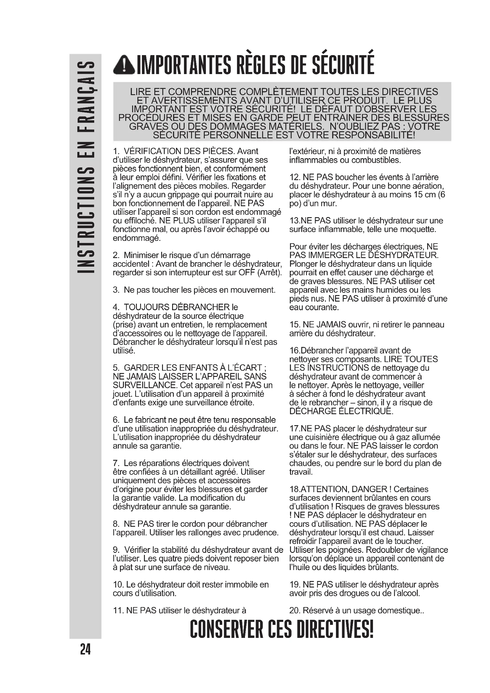PARCE QUE NOS PRODUITS BÉNÈFICIENT DE PERFECTIONNEMENTS CONSTANTS APPORTÉS EN USINE, LES ILLUSTRATIONS PRÉSENTES PEUVENT ÊTRE LÉGÈREMENT DIFFÉRENTES DU PRODUIT REÇU. 021215IMPORTANTES RÈGLES DE SÉCURITÉ LIRE ET COMPRENDRE COMPLÈTEMENT TOUTES LES DIRECTIVES ET AVERTISSEMENTS AVANT D’UTILISER CE PRODUIT. LE PLUS IMPORTANT EST VOTRE SÉCURITÉ! LE DÉFAUT D’OBSERVER LES PROCÉDURES ET MISES EN GARDE PEUT ENTRAINER DES BLESSURES GRAVES OU DES DOMMAGES MATÉRIELS. N’OUBLIEZ PAS : VOTRE SÉCURITÉ PERSONNELLE EST VOTRE RESPONSABILITÉ! CONSERVER CES DIRECTIVES! 1. VÉRIFICATION DES PIÈCES. Avant d’utiliser le déshydrateur, s’assurer que ses pièces fonctionnent bien, et conformément à leur emploi déni. Vérier les xations et l’alignement des pièces mobiles. Regarder s’il n’y a aucun grippage qui pourrait nuire au bon fonctionnement de l’appareil. NE PAS utiliser l’appareil si son cordon est endommagé ou efloché. NE PLUS utiliser l’appareil s’il fonctionne mal, ou après l’avoir échappé ou endommagé.2. Minimiser le risque d’un démarrage accidentel : Avant de brancher le déshydrateur, regarder si son interrupteur est sur OFF (Arrêt).3. Ne pas toucher les pièces en mouvement.4. TOUJOURS DÉBRANCHER le déshydrateur de la source électrique (prise) avant un entretien, le remplacement d’accessoires ou le nettoyage de l’appareil. Débrancher le déshydrateur lorsqu’il n’est pas utilisé.5. GARDER LES ENFANTS À L’ÉCART ; NE JAMAIS LAISSER L’APPAREIL SANS SURVEILLANCE. Cet appareil n’est PAS un jouet. L’utilisation d’un appareil à proximité d’enfants exige une surveillance étroite.6. Le fabricant ne peut être tenu responsable d’une utilisation inappropriée du déshydrateur. L’utilisation inappropriée du déshydrateur annule sa garantie. 7. Les réparations électriques doivent être conées à un détaillant agréé. Utiliser uniquement des pièces et accessoires d’origine pour éviter les blessures et garder la garantie valide. La modication du déshydrateur annule sa garantie.8. NE PAS tirer le cordon pour débrancher l’appareil. Utiliser les rallonges avec prudence.9. Vérier la stabilité du déshydrateur avant de l’utiliser. Les quatre pieds doivent reposer bien à plat sur une surface de niveau.10. Le déshydrateur doit rester immobile en cours d’utilisation.11. NE PAS utiliser le déshydrateur à l’extérieur, ni à proximité de matières inammables ou combustibles.12. NE PAS boucher les évents à l’arrière du déshydrateur. Pour une bonne aération, placer le déshydrateur à au moins 15 cm (6 po) d’un mur. 13.NE PAS utiliser le déshydrateur sur une surface inammable, telle une moquette. Pour éviter les décharges électriques, NE PAS IMMERGER LE DÉSHYDRATEUR. Plonger le déshydrateur dans un liquide pourrait en effet causer une décharge et de graves blessures. NE PAS utiliser cet appareil avec les mains humides ou les pieds nus. NE PAS utiliser à proximité d’une eau courante.15. NE JAMAIS ouvrir, ni retirer le panneau arrière du déshydrateur.16.Débrancher l’appareil avant de nettoyer ses composants. LIRE TOUTES LES INSTRUCTIONS de nettoyage du déshydrateur avant de commencer à le nettoyer. Après le nettoyage, veiller à sécher à fond le déshydrateur avant de le rebrancher – sinon, il y a risque de DÉCHARGE ÉLECTRIQUE.17.NE PAS placer le déshydrateur sur une cuisinière électrique ou à gaz allumée ou dans le four. NE PAS laisser le cordon s’étaler sur le déshydrateur, des surfaces chaudes, ou pendre sur le bord du plan de travail.18.ATTENTION, DANGER ! Certaines surfaces deviennent brûlantes en cours d’utilisation ! Risques de graves blessures ! NE PAS déplacer le déshydrateur en cours d’utilisation. NE PAS déplacer le déshydrateur lorsqu’il est chaud. Laisser refroidir l’appareil avant de le toucher.Utiliser les poignées. Redoubler de vigilance lorsqu’on déplace un appareil contenant de l’huile ou des liquides brûlants.19. NE PAS utiliser le déshydrateur après avoir pris des drogues ou de l’alcool. 20. Réservé à un usage domestique..