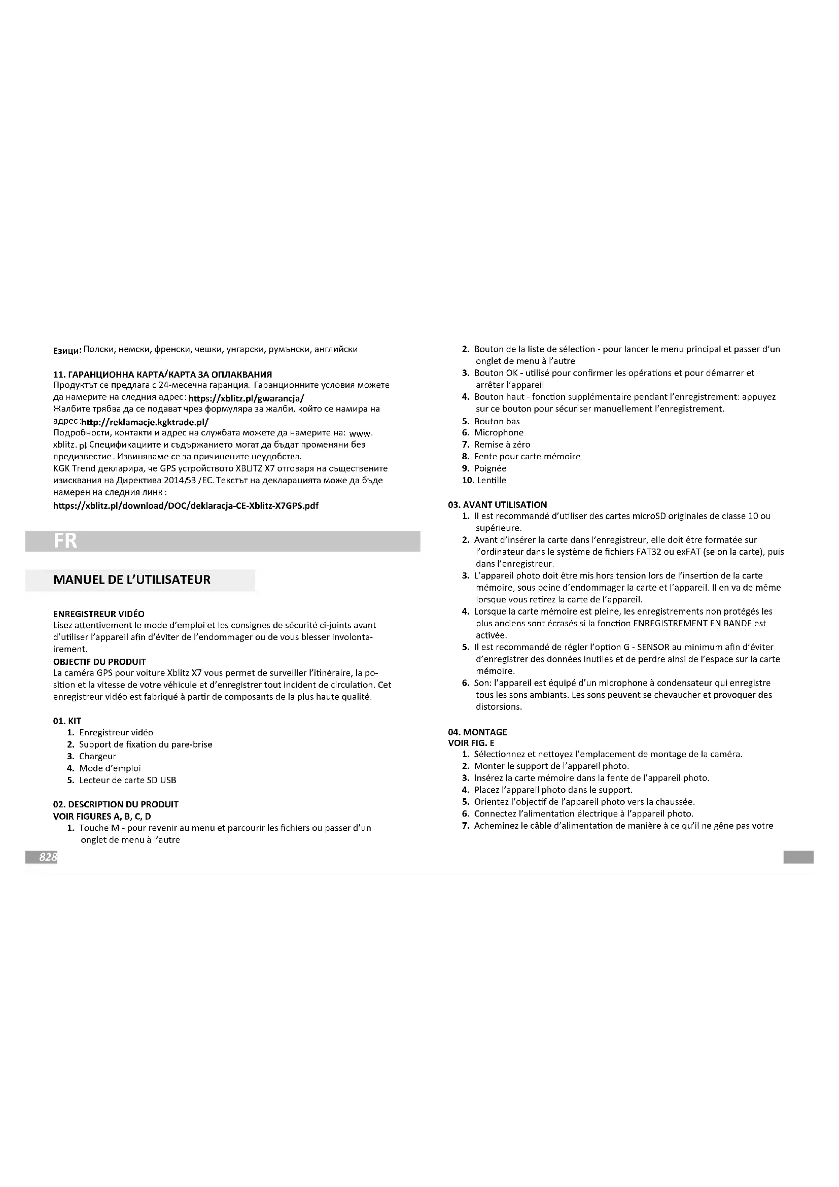 Le produit est assor d’une garane de 24 mois. Les condions de garane peuvent être consultées à l’adresse suivante: hps://xblitz.pl/gwarancja/ Les plaintes doivent être déposées à l’aide du formulaire de plainte disponible à l’adresse suivante: hp://reklamacje.kgktrade.pl/ Les détails, le contact et l’adresse du service sont disponibles à l’adresse suivante: www.xblitz.pl. Les spécicaons et le contenu peuvent être modiés sans préavis. Nous nous excusons pour tout désagrément. KGK Trend déclare que le disposif GPS XBLITZ X7 est conforme aux exigences essenelles de la direcve 2014/53/UE. Le texte de la déclaraon est disponible sur le lien: hps://xblitz.pl/download/DOC/deklaracja-CE-Xblitz-X7GPS.pdf90 91