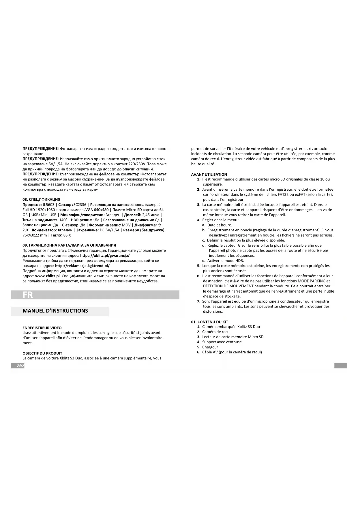 Le produit est assor d’une garane de 24 mois. Les condions de garane peuvent être consultées à l’adresse suivante : hps://xblitz.pl/gwarancja/ Les réclamaons doivent être eectuées à l’aide du formulaire de réclamaon disponible à l’adresse suivante : hp://reklamacje.kgktrend.pl/. Les détails, le contact et l’adresse du service après-vente se trouvent à l’adresse suivante : www.xblitz.pl. Les spécicaons et le contenu du kit peuvent être modi- és sans préavis. Nous nous excusons pour tout désagrément.84 85 tu i suoni ambientali. I suoni possono sovrapporsi causando distorsioni.