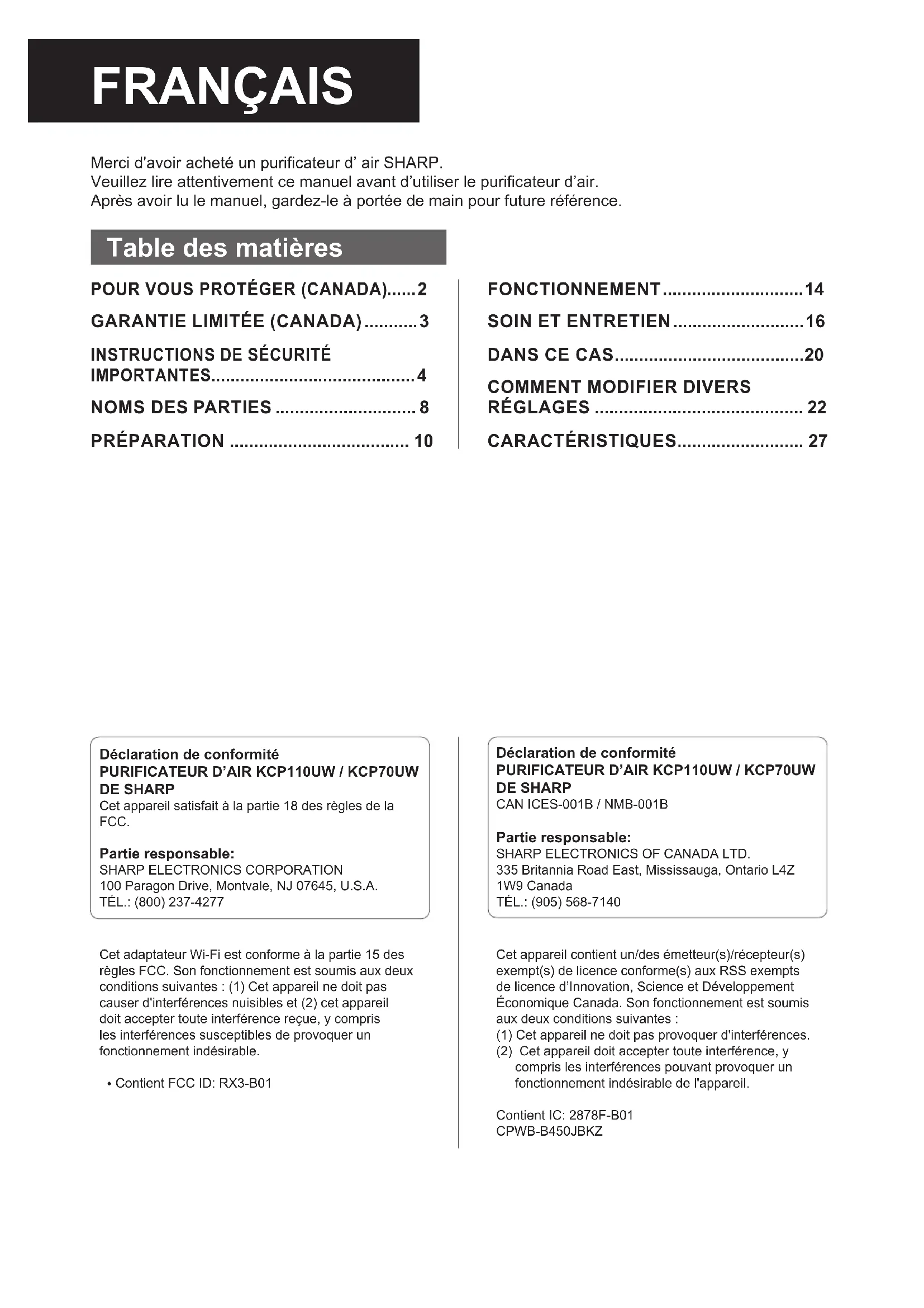 - CARACTÉRISTIQUES Table des matières Déclaration de conformité PURIFICATEUR D’AIR KCP110UW / KCP70UW DE SHARP Cet appareil satisfait à la partie 18 des règles de la FCC. Partie responsable: SHARP ELECTRONICS CORPORATION100 Paragon Drive, Montvale, NJ 07645, U.S.A.TÉL.: (800) 237-4277Cet adaptateur Wi-Fi est conforme à la partie 15 des règles FCC. Son fonctionnement est soumis aux deux conditions suivantes : (1) Cet appareil ne doit pas causer d'interférences nuisibles et (2) cet appareil doit accepter toute interférence reçue, y compris les interférences susceptibles de provoquer un fonctionnement indésirable. Contient FCC ID: RX3-B01 Déclaration de conformité PURIFICATEUR D’AIR KCP110UW / KCP70UW DE SHARP p. 27