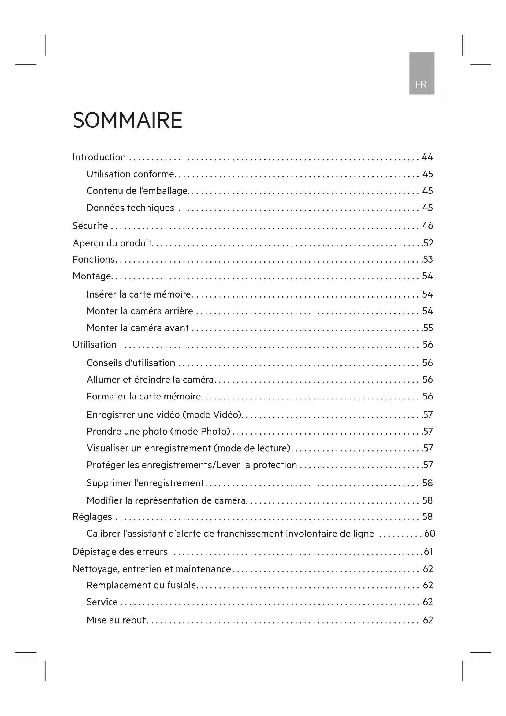 OK pour débuter la calibration. Appuyez sur la touche MENU pour interrompre la calibration. Le réglage actif est représenté par une ligne rouge. La calibration actuelle Réglages Description / Valeurs Réglage de l’horloge Régler la date/l’heure. LDWS Activer ou désactiver l’assistant d’alerte de franchissement involontaire de ligne. Marche, Arrêt FCWS Activer ou désactiver l’assistant de respect des distances. Marche, Arrêt Calibration LDWS voir « Calibration d’assistant d’alerte de franchissement involontaire de ligne » Éclairage Régler la correction d’exposition. -2, -1.7, -1.3, -1, -0.7, -0.3, 0, 0.3, 0.7, 1, 1.3, 1.7, 2 Version FW Aichage de version de progiciel61 Français