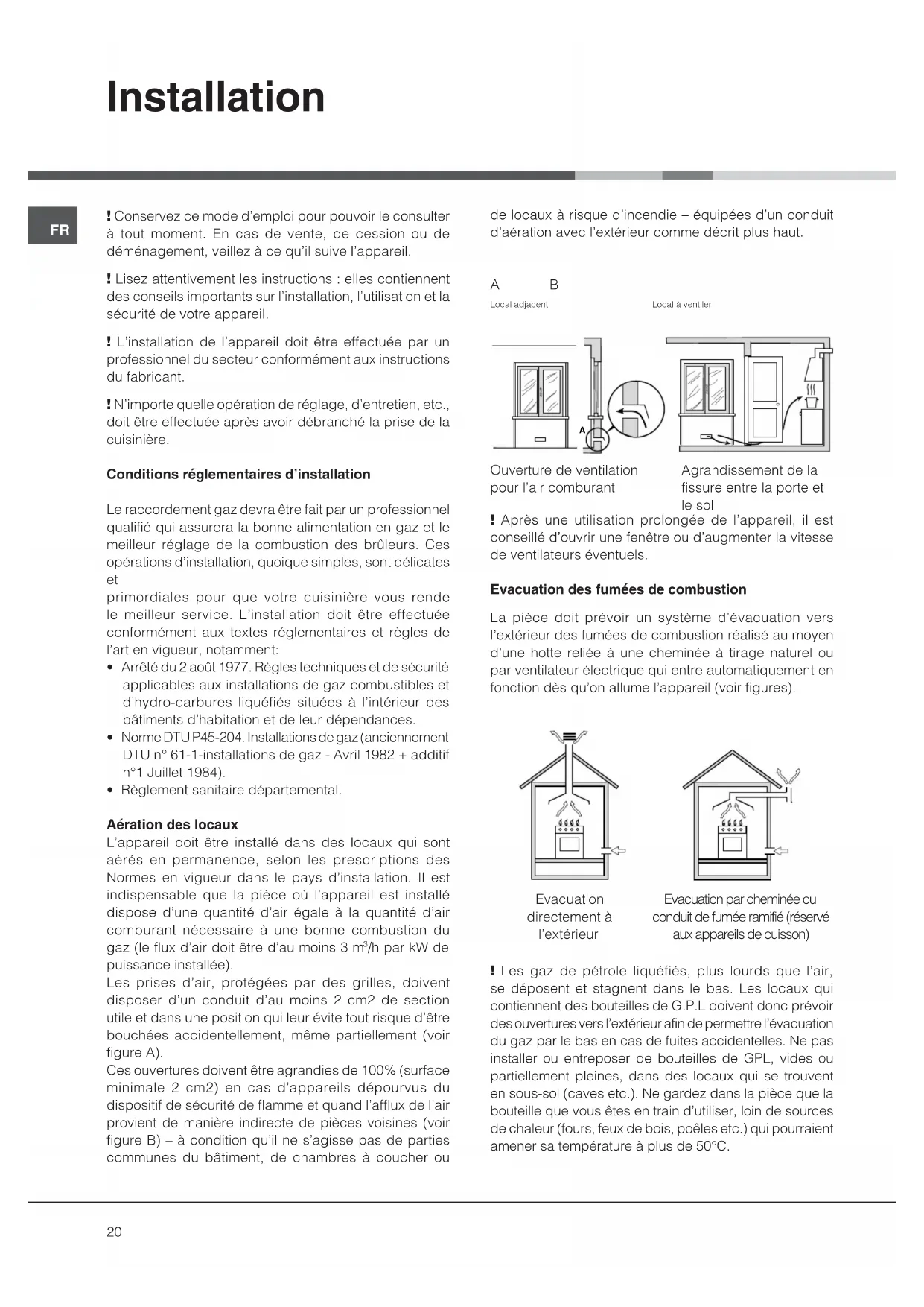 /h par kW de puissance installée). Les prises d’air, protégées par des grilles, doivent disposer d’un conduit d’au moins 2 cm2 de section utile et dans une position qui leur évite tout risque d’être bouchées accidentellement, même partiellement (voir figure A). Ces ouvertures doivent être agrandies de 100% (surface minimale 2 cm2) en cas d’appareils dépourvus du dispositif de sécurité de flamme et quand l’afflux de l’air provient de manière indirecte de pièces voisines (voir figure B) – à condition qu’il ne s’agisse pas de parties communes du bâtiment, de chambres à coucher ou de locaux à risque d’incendie – équipées d’un conduit d’aération avec l’extérieur comme décrit plus haut. A B ! Après une utilisation prolongée de l’appareil, il est conseillé d’ouvrir une fenêtre ou d’augmenter la vitesse de ventilateurs éventuels. Evacuation des fumées de combustion La pièce doit prévoir un système d’évacuation vers l’extérieur des fumées de combustion réalisé au moyen d’une hotte reliée à une cheminée à tirage naturel ou par ventilateur électrique qui entre automatiquement en fonction dès qu’on allume l’appareil (voir figures). ! Les gaz de pétrole liquéfiés, plus lourds que l’air, se déposent et stagnent dans le bas. Les locaux qui contiennent des bouteilles de G.P.L doivent donc prévoir des ouvertures vers l’extérieur afin de permettre l’évacuation du gaz par le bas en cas de fuites accidentelles. Ne pas installer ou entreposer de bouteilles de GPL, vides ou partiellement pleines, dans des locaux qui se trouvent en sous-sol (caves etc.). Ne gardez dans la pièce que la bouteille que vous êtes en train d’utiliser, loin de sources de chaleur (fours, feux de bois, poêles etc.) qui pourraient amener sa température à plus de 50°C.
