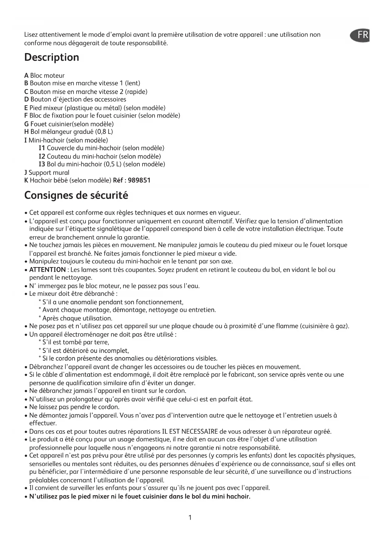 Lisez attentivement le mode d’emploi avant la première utilisation de votre appareil : une utilisation non conforme nous dégagerait de toute responsabilité. Description A Bloc moteur B Bouton mise en marche vitesse 1 (lent) C Bouton mise en marche vitesse 2 (rapide) D Bouton d’éjection des accessoires E Pied mixeur (plastique ou métal) (selon modèle) F Bloc de fixation pour le fouet cuisinier (selon modèle) G Fouet cuisinier(selon modèle) H Bol mélangeur gradué (0,8 L) I Mini-hachoir (selon modèle) I1 Couvercle du mini-hachoir (selon modèle) I2 Couteau du mini-hachoir (selon modèle) I3 Bol du mini-hachoir (0,5 L) (selon modèle) J Support mural K Hachoir bébé (selon modèle) Réf : 989851 Consignes de sécurité