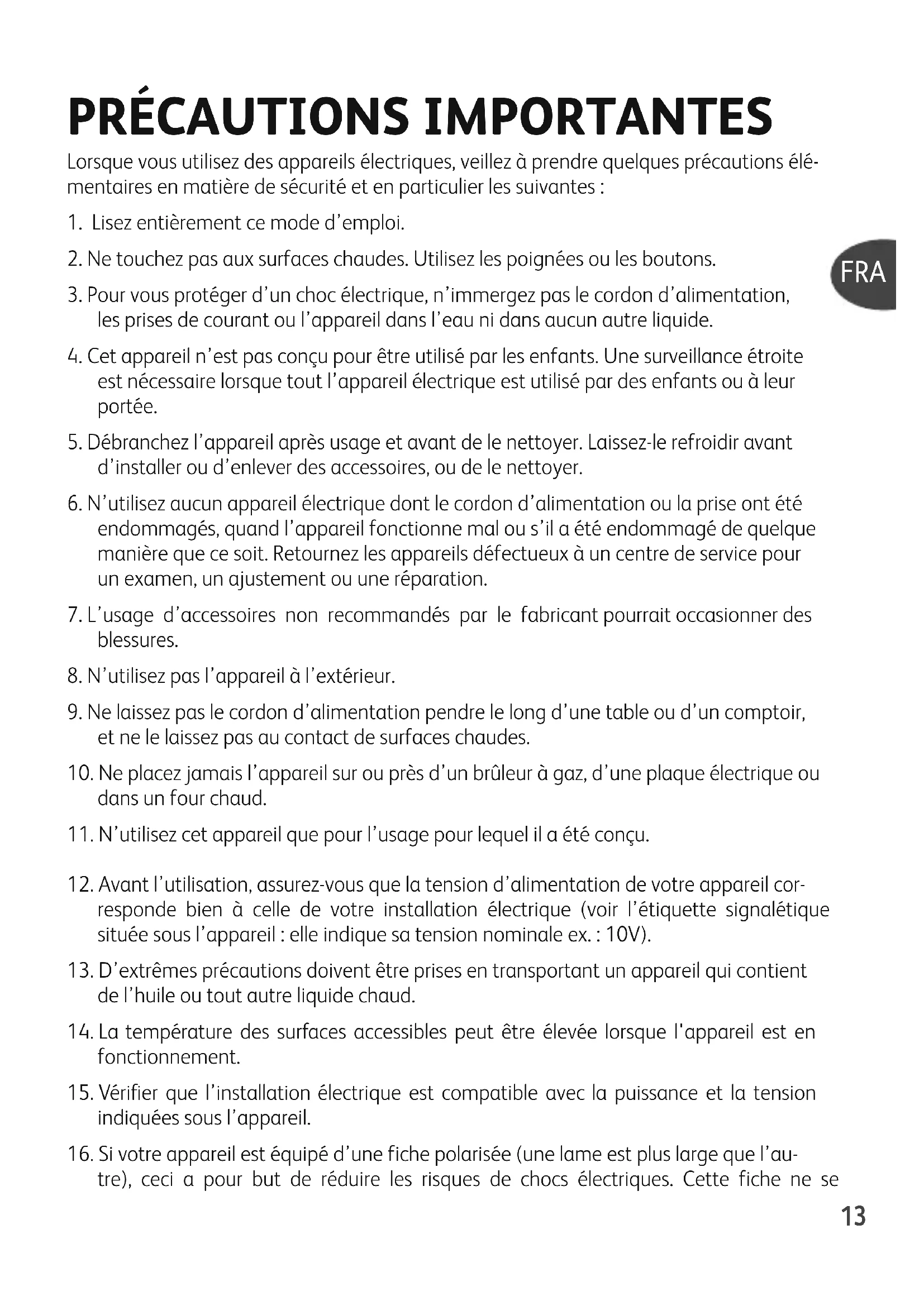 tre), ceci a pour but de réduire les risques de chocs électriques. Cette fiche ne se Tfal-EZCLEAN-2016217114_Tfal-EZCLEAN-2016217114 07/12/09 15:07 Page13branche que dans un sens. Si la fiche ne rentre pas correctement dans la prise murale,mettez-la dans l’autre sens. Si elle ne rentre toujours pas, contactez un électricien. Nemodifiez en aucune façon la prise. CONSERVEZ CES INSTRUCTIONS. Consignes de sécurité