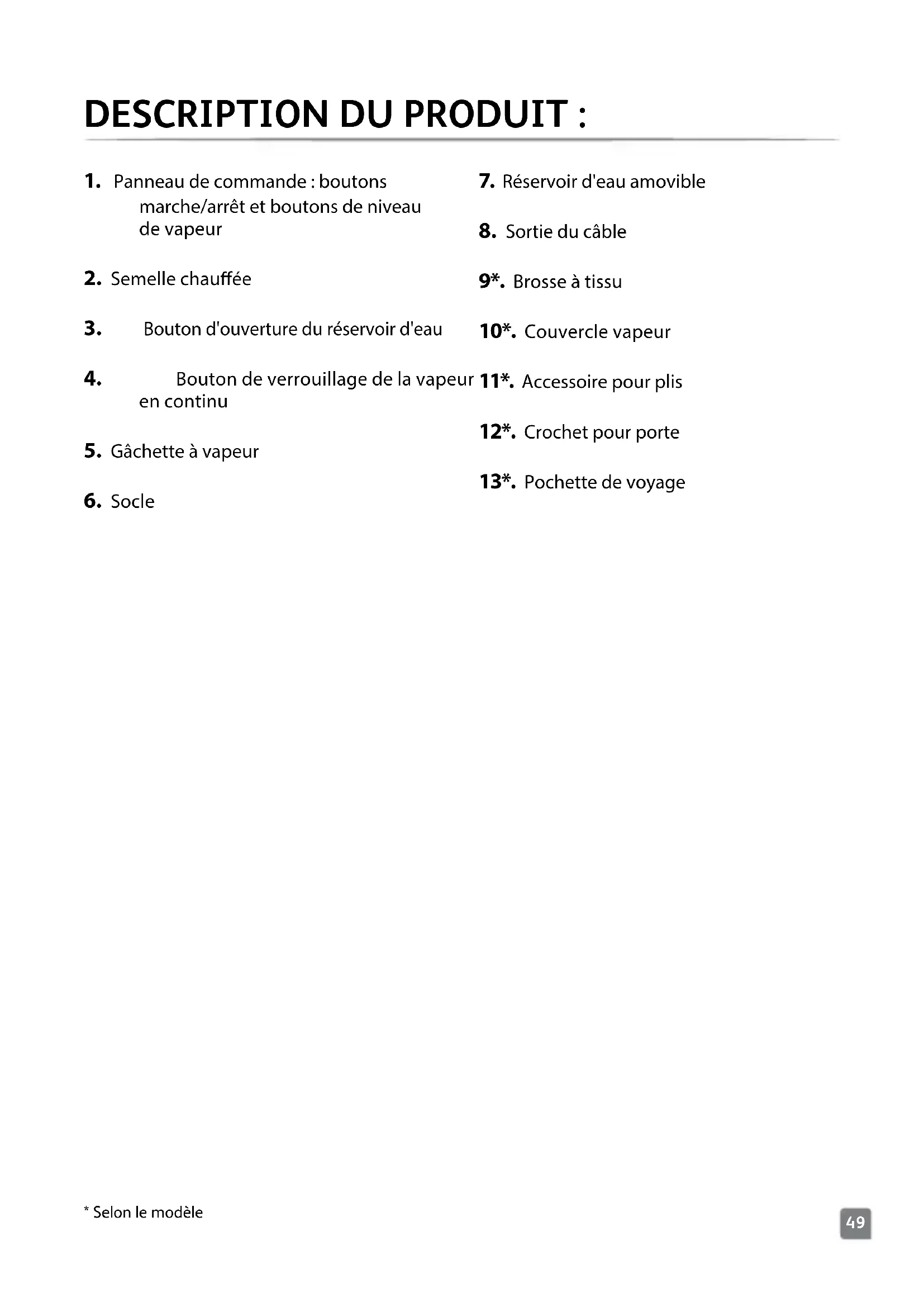 9*. Brosse à tissu 10*. Couvercle vapeur 11*. Accessoire pour plis 12*. Crochet pour porte 13*. Pochette de voyage