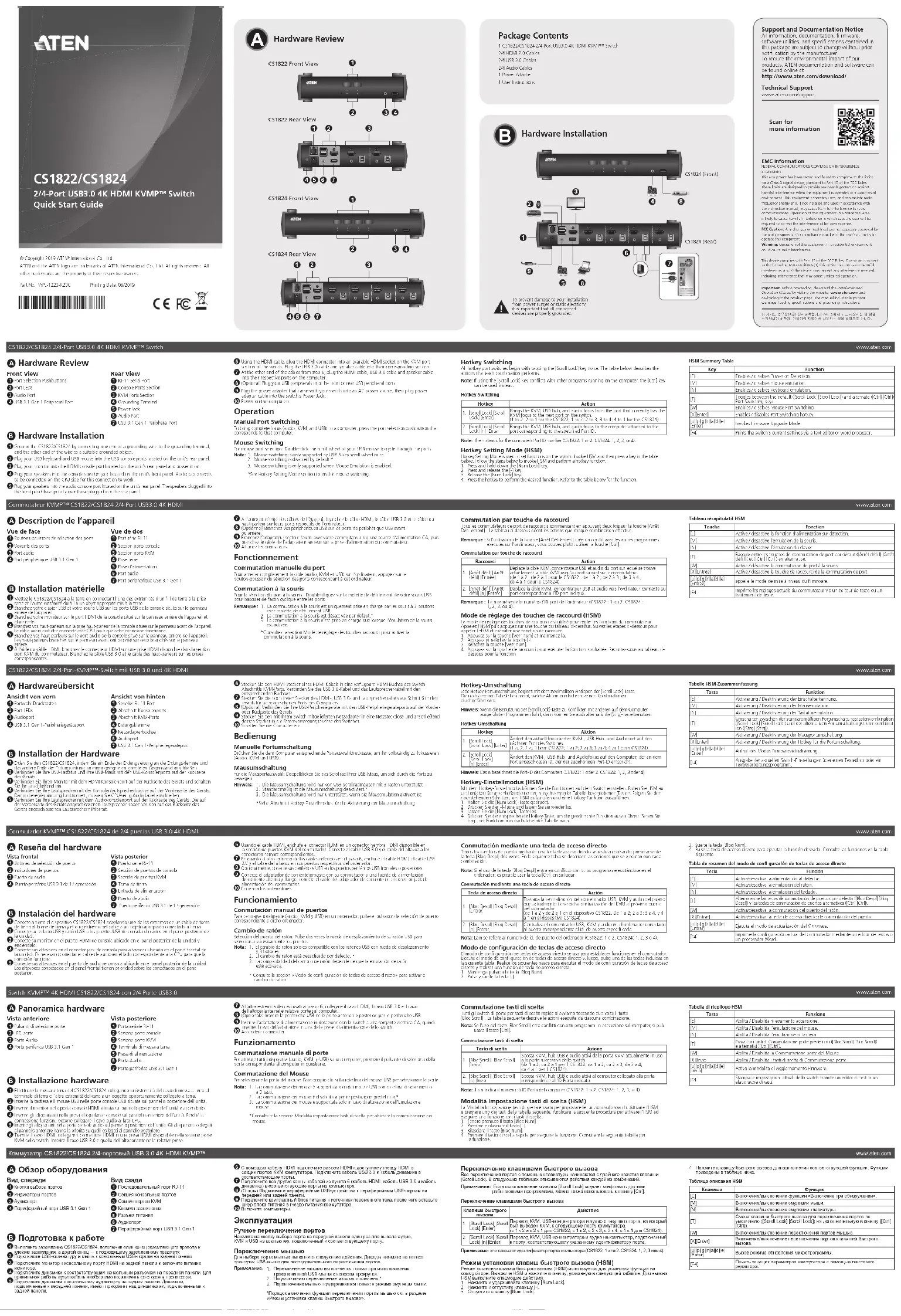 dessous pour la fonction.Commutateur KVMP™ CS1822/CS1824 2/4-Port USB3.0 4K HDMIwww.aten.comTableau récapitulatif HSMTouche Fonction [E] Active / désactive la fonction d’alimentation sur détection.[M] Active / désactive l’émulation de la souris.[N] Active / désactive l’émulation du clavier. [T] Bascule entre les touches de commutation de port par défaut ([Arrêt défi l] [Arrêt défi l]) et ([Ctrl] [Ctrl]) en alternative.[W] Active / désactive la commutation de port à la souris.[X][Entrée] Active / désactive la touche de raccourci de la commutation de port.[u][p][g][r][a][d][e][Entrée]appelle le mode de mise à niveau du fi rmware. [F4] Imprime les réglages actuels du commutateur via un éditeur de texte ou un traitement de texte.