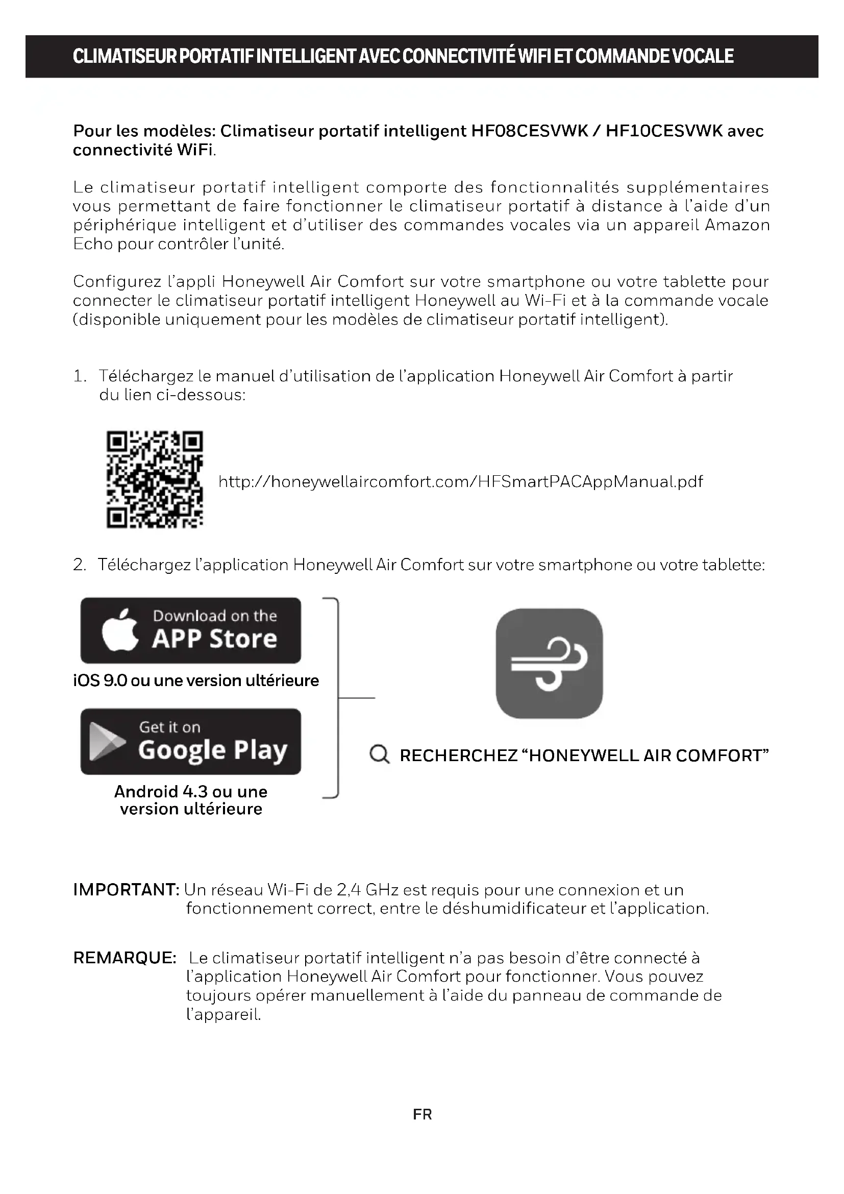 CLIMATISEUR PORTATIF INTELLIGENT AVEC CONNECTIVITÉ WIFI ET COMMANDE VOCALE IMPORTANT: Un réseau Wi-Fi de 2,4 GHz est requis pour une connexion et un fonctionnement correct, entre le déshumidificateur et l’application. REMARQUE: Le climatiseur portatif intelligent n’a pas besoin d’être connecté à l’application Honeywell Air Comfort pour fonctionner. Vous pouvez toujours opérer manuellement à l’aide du panneau de commande de l’appareil. http://honeywellaircomfort.com/HFSmartPACAppManual.pdf•