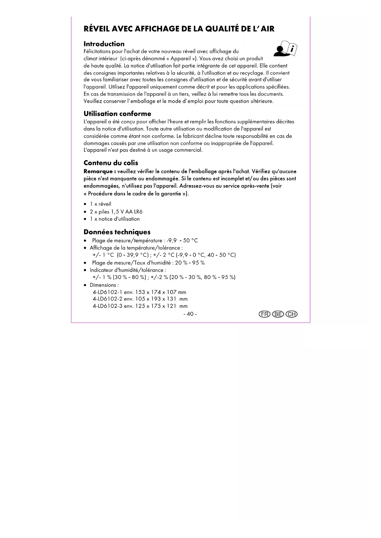 Lieferant Bitte beachten Sie, dass die folgende Anschrift keine Serviceanschrift ist. Kontaktieren Sie zunächst die oben benannte Servicestelle. digi-tech gmbh Valterweg 27A 65817 Eppstein DEUTSCHLAND- 38 - Utilisation et avertissements de sécurité Sommaire Sommaire .................................................................................................- 38 - Introduction ..............................................................................................- 40 - Utilisation conforme .................................................................................- 40 - Contenu du colis ......................................................................................- 40 - Données techniques ................................................................................- 40 - Explication des symboles ........................................................................- 41 - Explication des symboles des piles ........................................................- 42 - Consignes de sécurité importantes Consignes de sécurité importantesConsignes de sécurité importantes Consignes de sécurité importantes.....................................................- 43 - Consignes de sécurité pour les utilisateurs ......................................- 43 - Avis d'épilepsie ..................................................................................- 43 - Consignes de sécurité pour les piles ................................................- 44 - Veillez à la sécurité lors de l'installation de l'appareil ...................- 45 - Écran.........................................................................................................- 46 - Panneaux de commande ........................................................................- 47 - Mise en service ........................................................................................- 47 - Réglage ....................................................................................................- 48 - Réglage de base et de l'heure .........................................................- 48 - Alarme ......................................................................................................- 48 - Réglage de l´alarme ........................................................................- 48 - Activer ou désactiver l'alarme ..........................................................- 48 - Fonction de répétition de l'alarme (SNOOZE) ..............................- 48 - Lumière/veilleuse ....................................................................................- 49 - Régler la lumière/veilleuse ..............................................................- 49 - Allumer et éteindre la lumière/la veilleuse .....................................- 49 - Température .............................................................................................- 49 - Affichage 12/24 heures ........................................................................- 49 - Consignes d´entretien ............................................................................- 49 - Stockage ..................................................................................................- 50 - Déclaration de conformité UE simplifiée ...............................................- 50 - Élimination ................................................................................................- 50 - Élimination de l'équipement électrique ............................................- 50 - Élimination des piles ..........................................................................- 51 - Recyclage ..........................................................................................- 53 - Élimination des déchets .....................................................................- 53 -- 39 - Logo TRIMAN ...................................................................................- 53 - Garantie digi-tech gmbh ........................................................................- 53 - Conditions de garantie .....................................................................- 53 - Période de garantie et réclamations légales pour défauts ............- 54 - Étendue de la garantie .....................................................................- 54 - Procédure de mise en œuvre de la garantie ..................................- 54 - Service ......................................................................................................- 55 - Fournisseur ...............................................................................................- 56 -- 40 - RÉVEIL AVEC AFFICHAGE DE LA QUALITÉ DE L’AIR Introduction Félicitations pour l'achat de votre nouveau réveil avec affichage du climat intérieur (ci-après dénommé « Appareil »). Vous avez choisi un produit de haute qualité. La notice d'utilisation fait partie intégrante de cet appareil. Elle contient des consignes importantes relatives à la sécurité, à l'utilisation et au recyclage. Il convient de vous familiariser avec toutes les consignes d'utilisation et de sécurité avant d'utiliser l'appareil. Utilisez l'appareil uniquement comme décrit et pour les applications spécifiées. En cas de transmission de l'appareil à un tiers, veillez à lui remettre tous les documents. Veuillez conserver l’emballage et le mode d’emploi pour toute question ultérieure. Utilisation conforme L'appareil a été conçu pour afficher l'heure et remplir les fonctions supplémentaires décrites dans la notice d'utilisation. Toute autre utilisation ou modification de l'appareil est considérée comme étant non conforme. Le fabricant décline toute responsabilité en cas de dommages causés par une utilisation non conforme ou inappropriée de l'appareil. L'appareil n'est pas destiné à un usage commercial. Contenu du colis Remarque : veuillez vérifier le contenu de l'emballage 