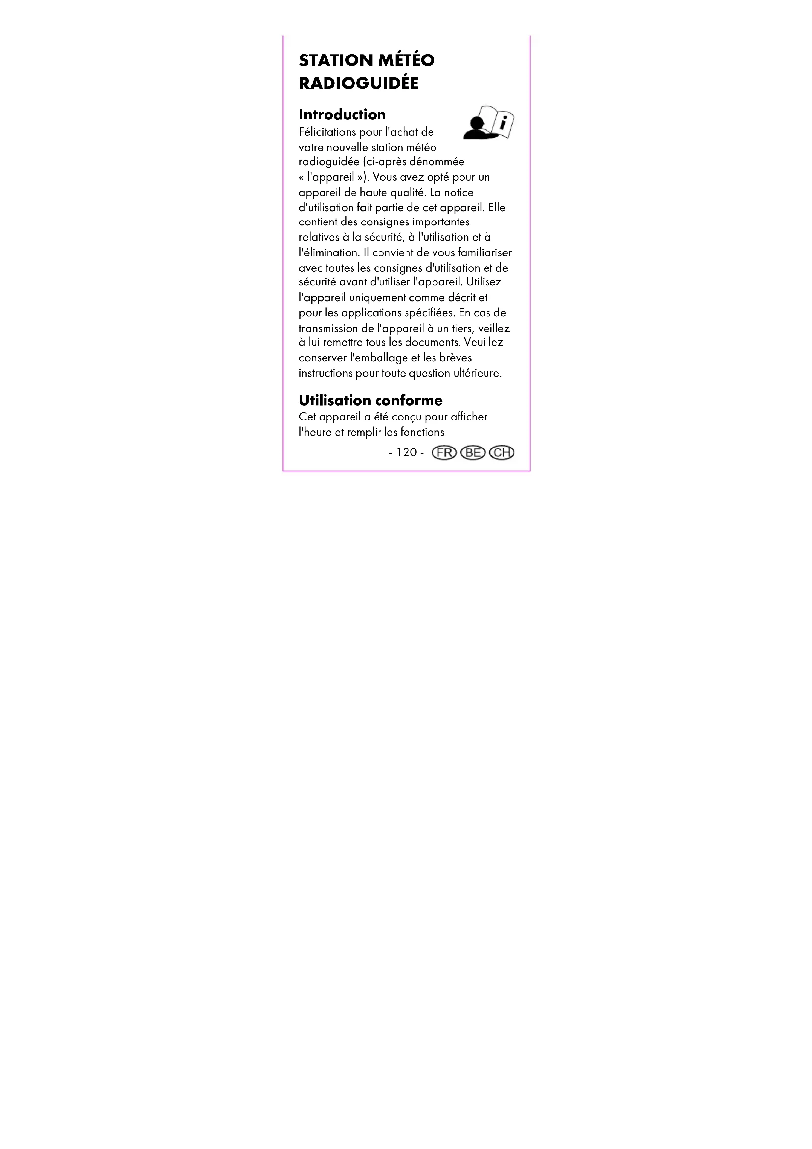 RADIOGUIDÉE Introduction Félicitations pour l'achat de votre nouvelle station météo radioguidée (ci-après dénommée « l'appareil »). Vous avez opté pour un appareil de haute qualité. La notice d'utilisation fait partie de cet appareil. Elle contient des consignes importantes relatives à la sécurité, à l'utilisation et à l'élimination. Il convient de vous familiariser avec toutes les consignes d'utilisation et de sécurité avant d'utiliser l'appareil. Utilisez l'appareil uniquement comme décrit et pour les applications spécifiées. En cas de transmission de l'appareil à un tiers, veillez à lui remettre tous les documents. Veuillez conserver l'emballage et les brèves instructions pour toute question ultérieure. Utilisation conforme Cet appareil a été conçu pour afficher l'heure et remplir les fonctions- 121 - supplémentaires décrites dans la notice d'utilisation. Toute autre utilisation ou modification de l'appareil est considérée comme non conforme. Le fabricant ne peut être tenu responsable des dommages causés par une utilisation non conforme ou inappropriée de l'appareil. L'appareil n'est pas destiné à un usage commercial. Contenu du colis Remarque : veuillez vérifier le contenu de l'emballage après l'achat. Vérifiez qu'aucune pièce ne manque ni n'est endommagée. Si le contenu est incomplet et/ou des pièces sont endommagées, n'utilisez pas l'appareil. Adressez-vous au service après-vente (voir « Règlement en cas de garantie »).