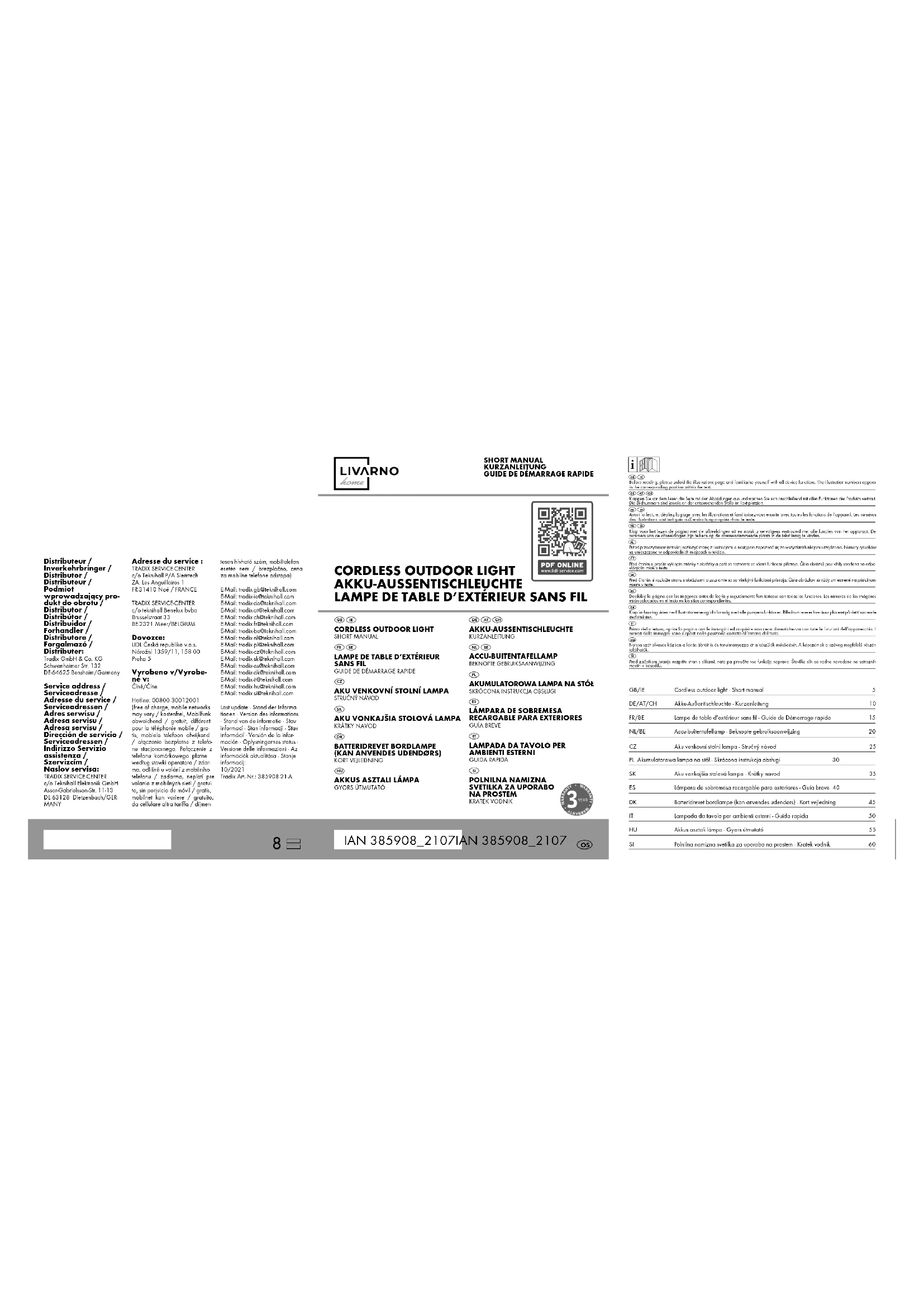 SANS FIL Guide de Démarrage rapide Ce document est une version imprimée abrégée du mode d’emploi complet. En scannant le code QR, vous accé- dez directement à la page de service de Lidl (www.lidl-service.com). En sai- sissant le numéro d’article (IAN) 385908_2107, vous pouvez consul- ter et télécharger le mode d’emploi complet. AVERTISSEMENT ! Respectez l’intégralité du mode d’emploi et les consignes de sécurité afin d’évi- ter tout dommage corporel et matériel. Le guide de démarrage rapide est partie intégrante du produit. Avant d’utiliser le produit, se familiariser avec toutes les consignes d’utilisation et de sécurité. Conservez le guide de démarrage rapide dans un endroit sûr et remettez tous les documents lorsque vous transmet- tez le produit à des tiers. L’article Lampe de table d’extérieur sans fil est dési- gné par produit ci-dessous. Ce symbole désigne un courant continu. Ce symbole désigne la classe de protection IP44 (protection contre les éclaboussures d'eau de tout côté). Ne s’applique pas pendant le processus de charge ! Ce symbole désigne la classe de protection