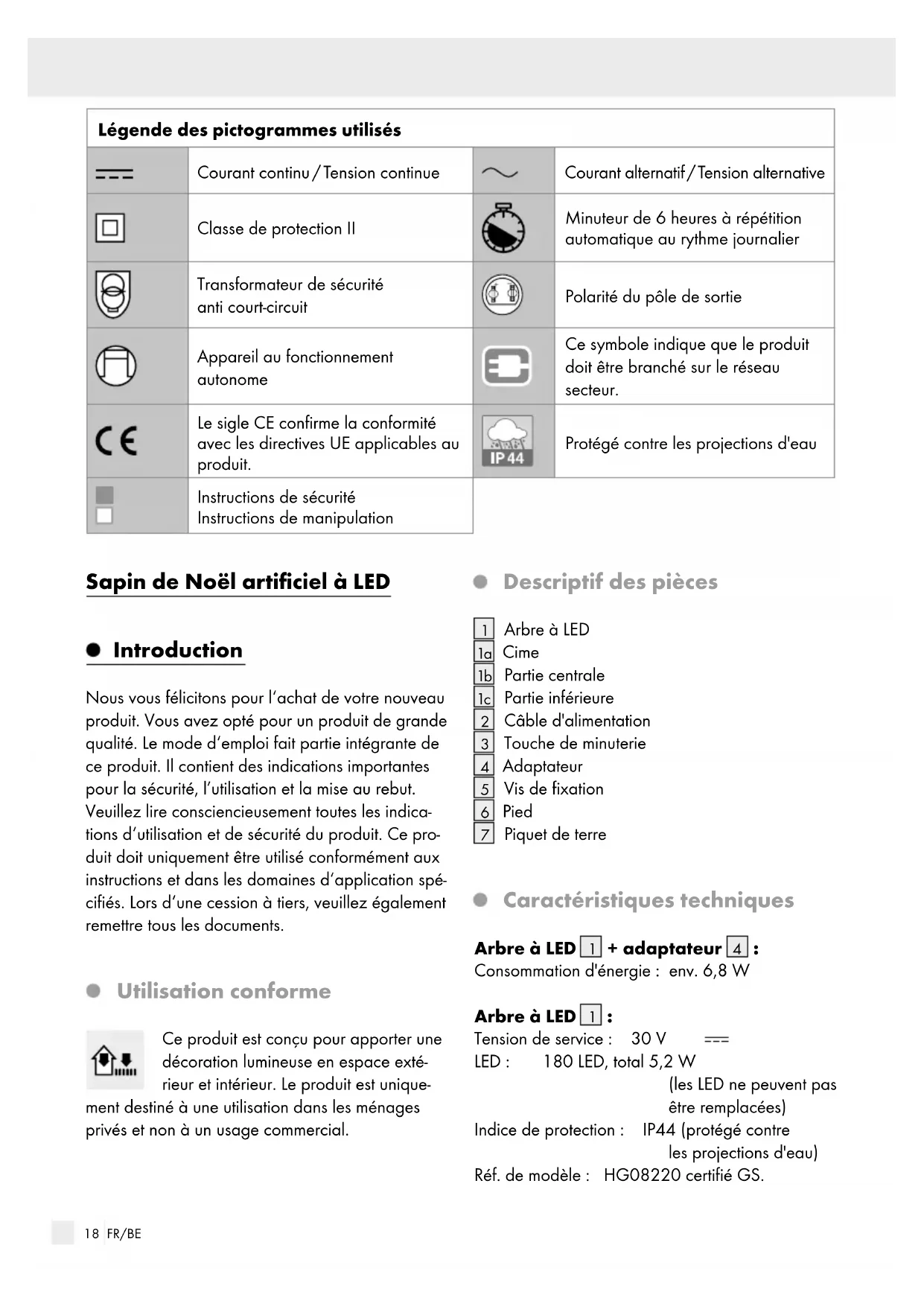 Contenu de la livraison 1 arbre à LED (1 cime, 1 partie centrale, 1 partie inférieure) 1 pied 1 adaptateur 3 vis de fixation 2 piquets de terre 1 mode d'emploi Consignes de sécurité