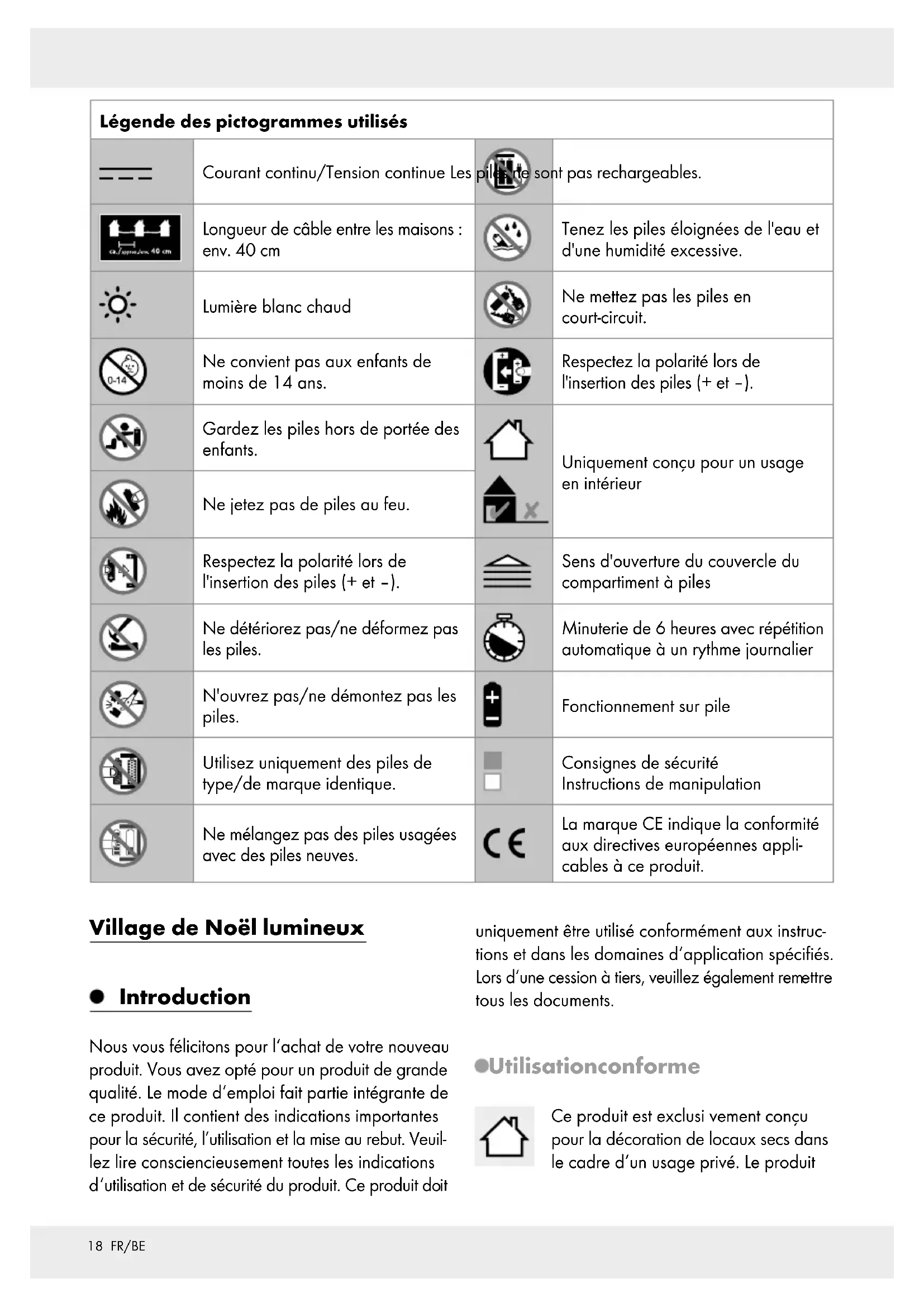 Puissance: 0,25 W Type de pile: 2 x 1,5 V de type AA (fournies) Contenu de la livraison 1 village de Noël lumineux 2 piles 1 mode d‘emploi Consignes de sécurité