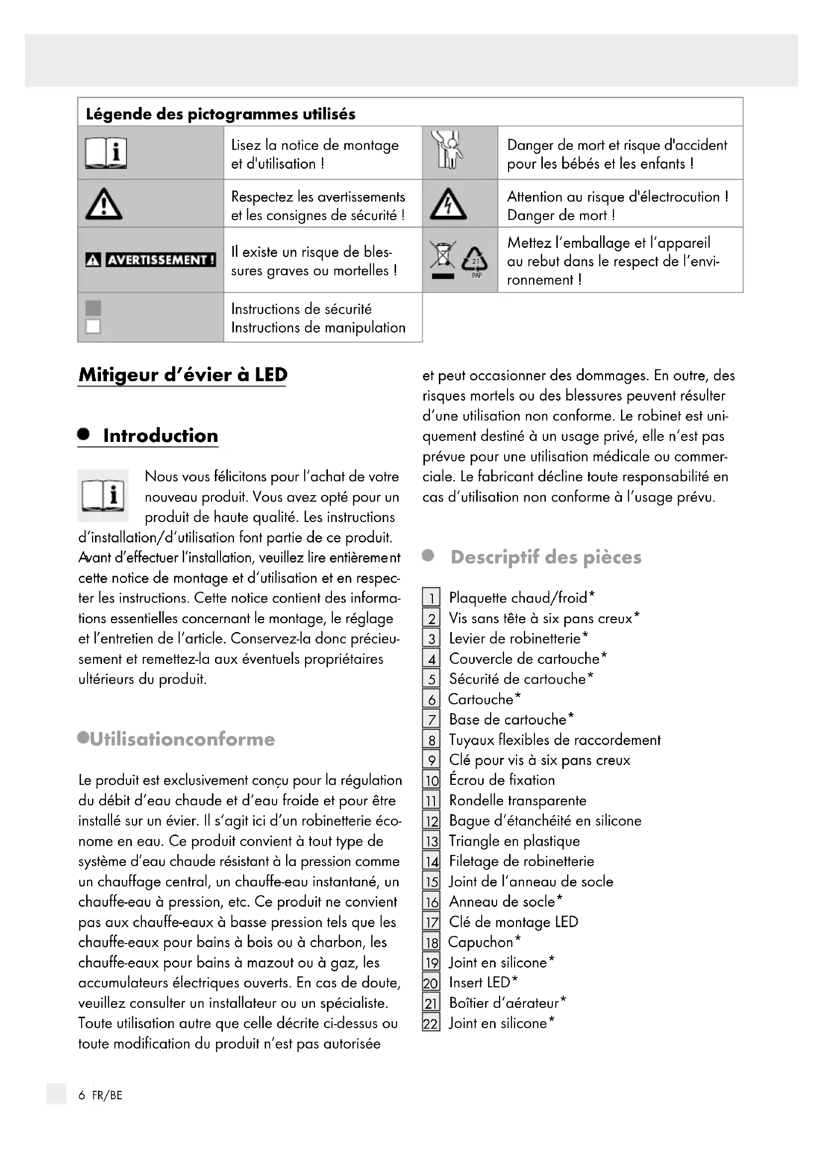 PAP Mettez l‘emballage et l‘appareil au rebut dans le respect de l‘envi- ronnement ! Instructions de sécurité Instructions de manipulation Mitigeur d’évier à LED Introduction Nous vous félicitons pour l‘achat de votre nouveau produit. Vous avez opté pour un produit de haute qualité. Les instructions d‘installation/d‘utilisation font partie de ce produit.