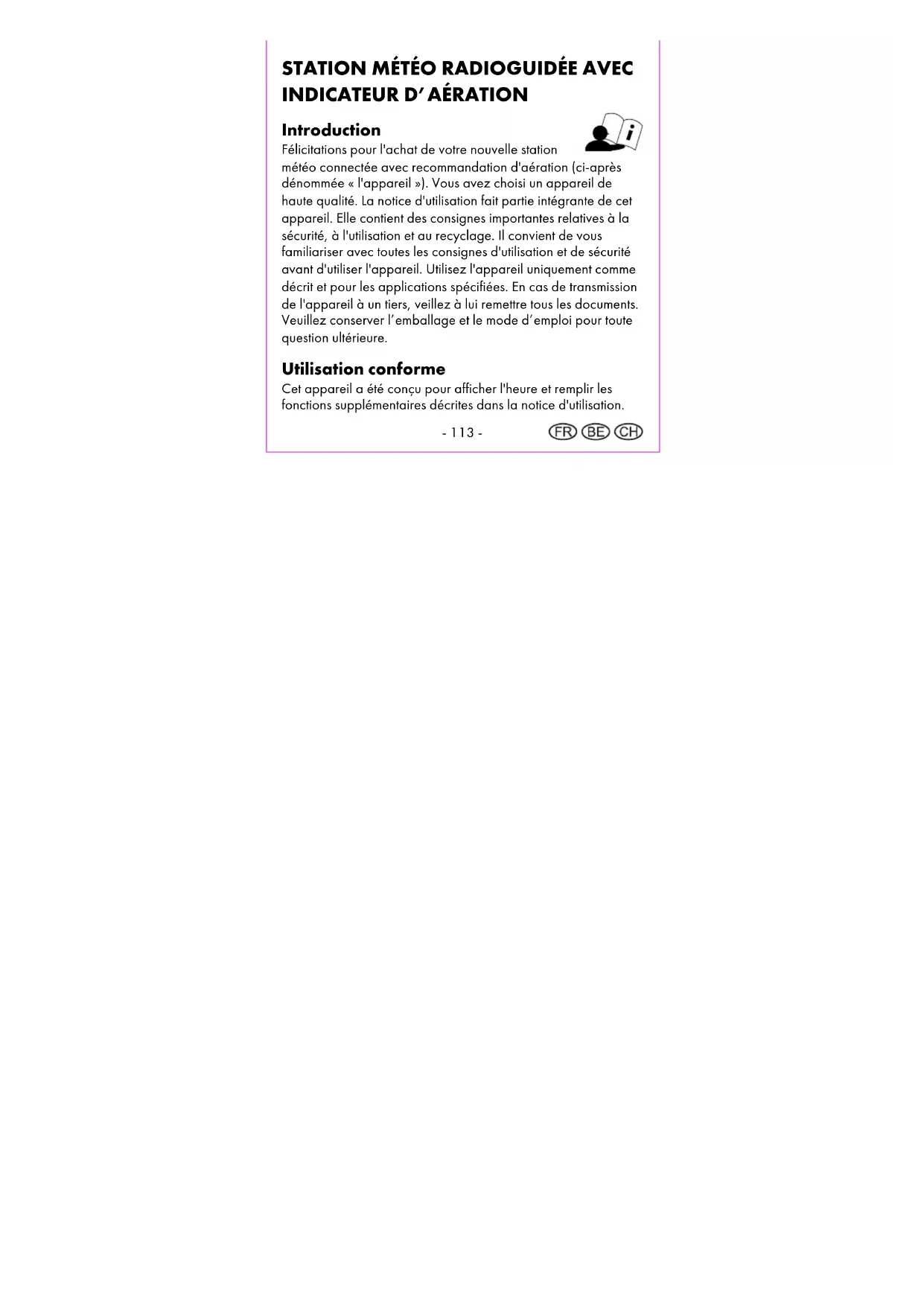 Introduction Félicitations pour l'achat de votre nouvelle station météo connectée avec recommandation d'aération (ci-après dénommée « l'appareil »). Vous avez choisi un appareil de haute qualité. La notice d'utilisation fait partie intégrante de cet appareil. Elle contient des consignes importantes relatives à la sécurité, à l'utilisation et au recyclage. Il convient de vous familiariser avec toutes les consignes d'utilisation et de sécurité avant d'utiliser l'appareil. Utilisez l'appareil uniquement comme décrit et pour les applications spécifiées. En cas de transmission de l'appareil à un tiers, veillez à lui remettre tous les documents. Veuillez conserver l’emballage et le mode d’emploi pour toute question ultérieure. Utilisation conforme Cet appareil a été conçu pour afficher l'heure et remplir les fonctions supplémentaires décrites dans la notice d'utilisation.- 114 - Toute autre utilisation ou modification de l'appareil est considérée comme non conforme. Le fabricant ne peut être tenu responsable des dommages causés par une utilisation non conforme ou inappropriée de l'appareil. L'appareil n'est pas destiné à un usage commercial. Contenu du colis Remarque : veuillez vérifier le contenu de l'emballage après l'achat. Vérifiez qu’aucune pièce ne manque ni n’est endommagée. Si le contenu est incomplet et/ou des pièces sont endommagées, n'utilisez pas l'appareil. Adressez-vous au service après-vente (voir « Règlement en cas de garantie »).