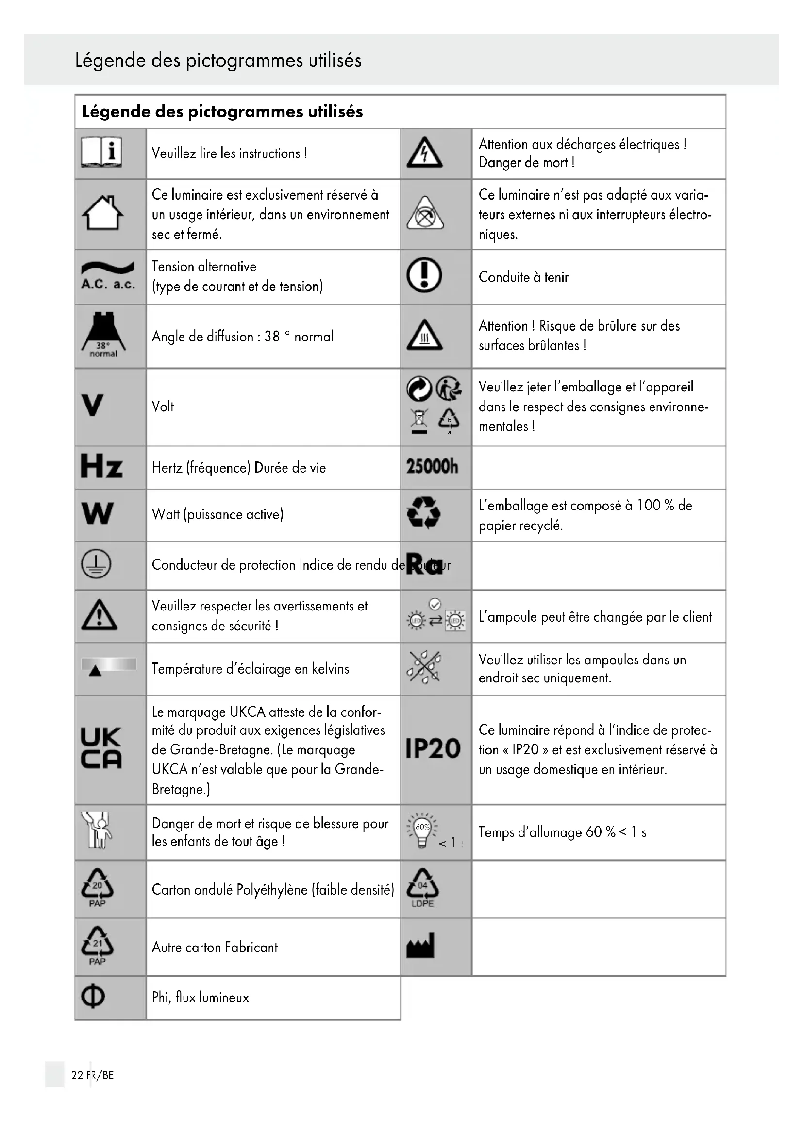 Garantie............................................................................................................................................Page 26 Adresse du service après-vente...................................................................................................... Page 27 Déclaration de conformité...............................................................................................................Page 27 Fabricant........................................................................................................................................... Page 27 Table des matières FR/BE 21Légende des pictogrammes utilisés Veuillez lire les instructions ! Attention aux décharges électriques ! Danger de mort ! Ce luminaire est exclusivement réservé à un usage intérieur, dans un environnement sec et fermé. Ce luminaire n’est pas adapté aux varia teurs externes ni aux interrupteurs électro niques. Tension alternative (type de courant et de tension) Conduite à tenir Angle de diffusion : 38 ° normal Attention ! Risque de brûlure sur des surfaces brûlantes ! Volt